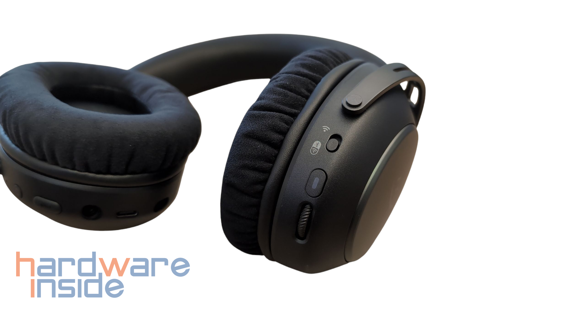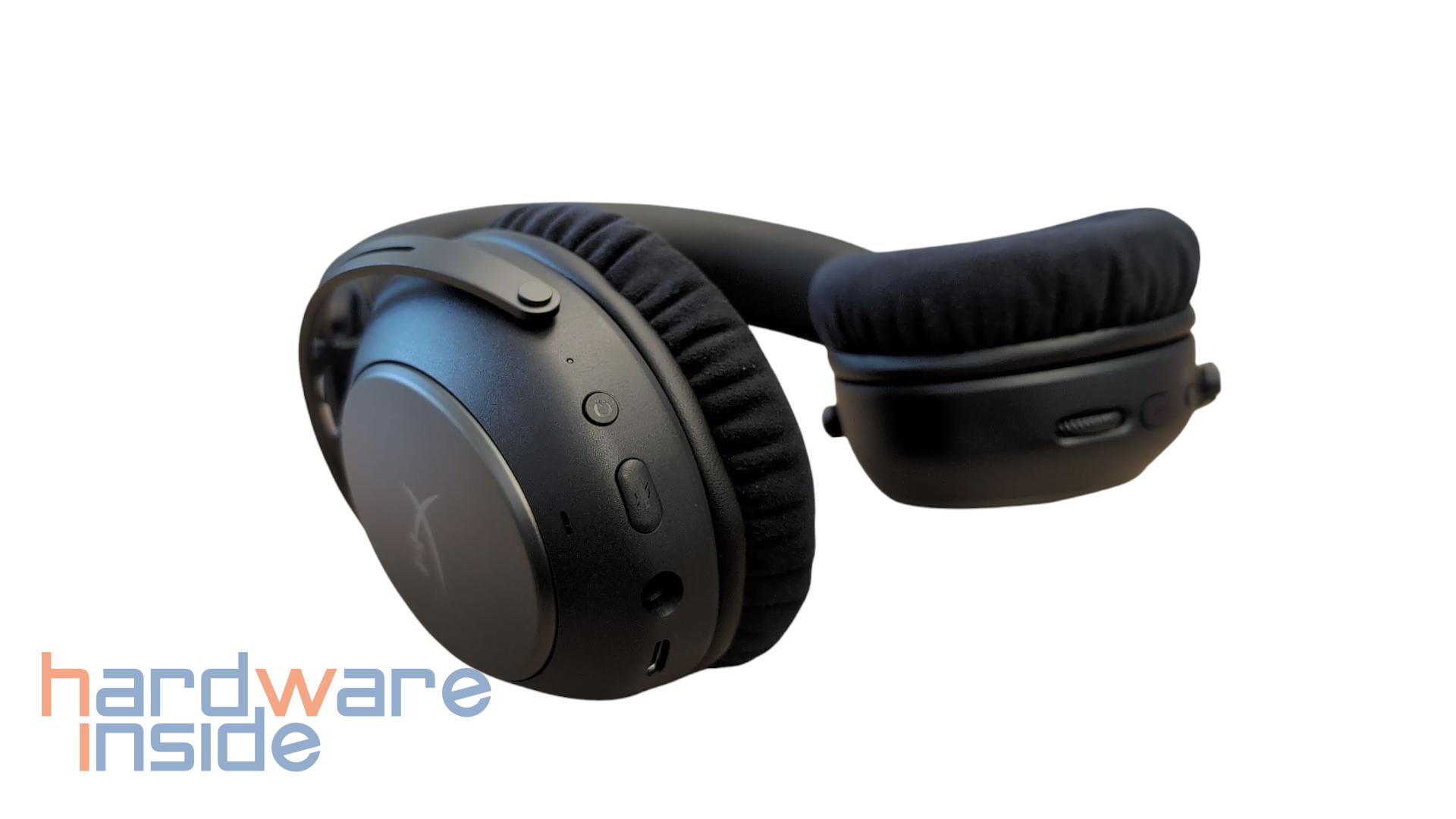 Die Außenseiten der Ohrmuscheln des HyperX Cloud Alpha Wireless 2 sind in mattem Schwarz gehalten und sind zentral mit dem Herstellerlogo versehen. Auf der Innenseite kommen atmungsaktive Ohrpolster aus Mikrofaser zum Einsatz, die mit weichen Memory-Schaum-Polstern ausgestattet sind. Die Ohrmuscheln sind mit einer Reihe von Anschlüssen und Bedienelementen ausgestattet. Auf der linken Seite befinden sich eine Status-LED, der Power-Button, ein Mikrofon-Mute-Schalter, das integrierte Mikrofon, eine 3,5-mm-Klinkenbuchse, ein USB-C-Port zum Aufladen sowie ein separater Mikrofonanschluss. Auf der rechten Seite sind ein Schalter für den Wireless-Modus, ein Multifunktions-Button und ein Lautstärkeregler untergebracht.