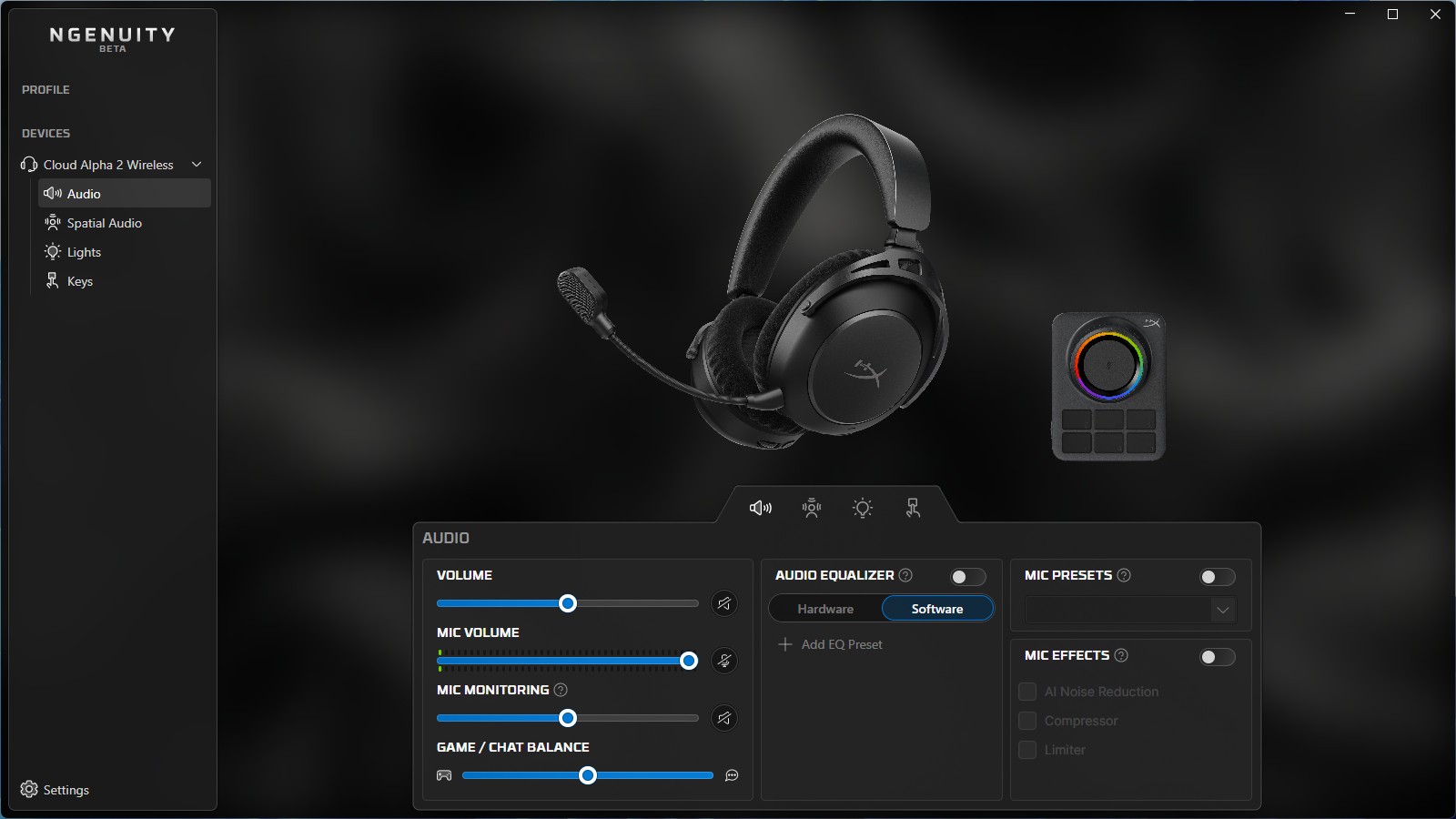 Wir haben die HyperX NGENUITY-Software auf unserem Testsystem eingerichtet und das Cloud Alpha 2 Wireless samt Basisstation verbunden. Bereits beim ersten Start meldete die Anwendung sowohl ein App-Update als auch ein Firmware-Update für das Headset. Für letzteres muss das Gerät per beiliegendem USB-Kabel angeschlossen werden, der Vorgang dauert etwa fünf Minuten. Die Benutzeroberfläche der NGENUITY-Software ist aufgeräumt gestaltet und bietet die wichtigsten Anpassungsmöglichkeiten. So lassen sich Lautstärke und Mikrofon-Empfindlichkeit regulieren, die Mikrofon-Überwachung aktivieren sowie der DTS-Spatial-Sound einschalten. Auch die Basisstation lässt sich konfigurieren, etwa durch das Anpassen der Beleuchtung des Lautstärkereglers oder die Belegung der sechs Funktionstasten. Darüber hinaus stehen verschiedene Equalizer-Presets zur Auswahl, ergänzt durch die Option, eigene Klangprofile zu erstellen. Insgesamt bleibt der Spielraum für Individualisierungen jedoch relativ begrenzt.