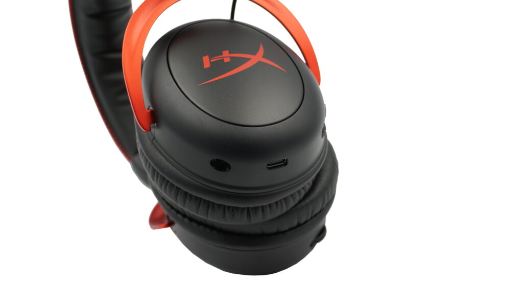 Beide Hörmuscheln sind mit einem weichen Kunstleder bezogen. Im Inneren sorgt ein Schaumstoffpolster für einen angenehmen Tragekomfort. An der Unterseite der Hörmuscheln ergeben sich die Unterschiede zur kabelgebundenen Version. An der linken Seite finden wir eine Taste zum Ein- bzw. Ausschalten und eine zum Stummschalten des Mikrofons. Weiter ist hier ein USB-C-Anschluss zum Laden des Akkus und der Anschluss für das Mikrofon. Auf der rechten Seite ist ein Rad zum Einstellen der Lautstärke verbaut. An dieser Stelle fällt uns auf, dass HyperX hier keinen Betrieb via Kabel vorgesehen hat – das wäre etwa praktisch, wenn der Akku zu Neige gegangen ist oder der Nutzer das Headset am Smartphone betreiben möchte.