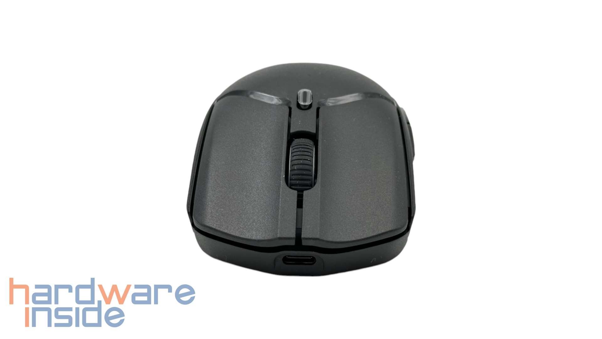 Die Oberseite ist im selben, leicht rauen, Kunststoff ausgeführt. Die beiden Haupttasten sind von einer angenehmen Größe. Zwischen den Tasten befindet sich das Mausrad, welches über eine gummierte Außenseite verfügt. Damit dieses nicht unter unserem Finger rutscht, ist es mit einem Profil versehen. Hinter dem Mausrad finden wir eine weitere Taste, mit der sich die Auflösungsstufe wechseln lässt. Der Rücken der Maus trägt das Logo des Herstellers. In dieser Ansicht können wir gut erkennen, dass es sich hier um eine symmetrisch geformte Maus handelt. Das heißt in diesem Fall, dass die linke wie auch die rechte Seite gleichmäßig gestaltet sind. So kann die Maus von Rechts- als auch von Linkshändern genutzt werden.