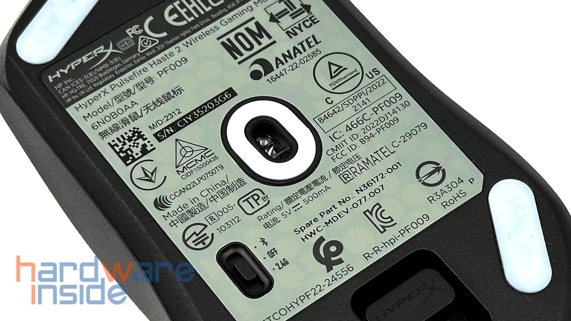 Nun werfen wir einen Blick auf die Unterseite der Maus. Hier sehen wir insgesamt fünf kleine Gleitflächen, davon je eine an den Ecken und eine, welche den Sensor umschließt. Im hinteren Teil befindet sich ein kleines Fach zur Aufbewahrung des USB-Funkempfängers, welcher hier magnetisch haftet. Mittig finden wir einen großen Aufkleber, welcher einige Informationen enthält. Mittig ist der optische HyperX 26K Sensor untergebracht. Etwas unterhalb des Sensors ist Links ein kleiner Schalter verbaut. Mit diesem lässt sich die jeweilige Verbindungsart auswählen.