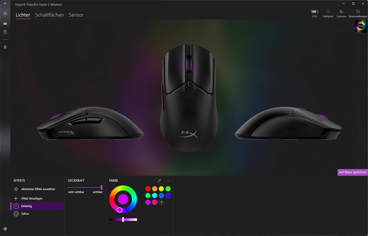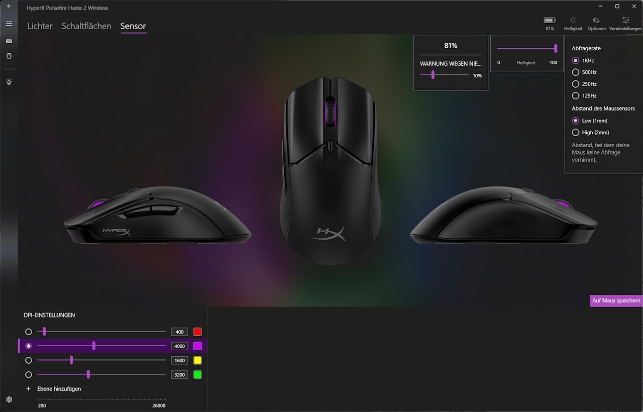 Zur Nutzung der HyperX Pulsefire Haste 2 Wireless ist die Software nicht zwingend erforderlich. Wer aber alle Einstellungen komfortabel tätigen will, der kommt nicht um die Installation der Software nicht herum. Hier kommt HyperX NGENUITY zum Einsatz, welche bequem und kostenlos über den Windows Store bezogen werden kann. Diese Software dient als Zentrale für nahezu alle Geräte des Herstellers. Im Test mit der HyperX Alloy Rise wissen wir, dass die Software gut funktioniert, allerdings ein paar Fehler in der Übersetzung der Texte hat.