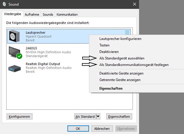 Da wir unsere Kopfhörer direkt am Mikrofon betreiben wollen wechseln wir in den Reiter „Wiedergabe“. Anschließend klicken wir dort rechts auf „Lautsprecher – HyperX Quadcast und wählen hier „Als Standardgerät auswählen“ und „Als Standardkommunikationsgerät gfestlegen“ aus.