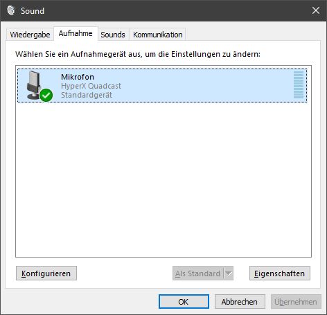 Im Reiter „Aufnahme“ müssten die Einstellungen auch für das Mikrofon selbst vorgenommen werden, wenn noch ein weiteres Mikrofon angeschlossen ist. Da dies aber bei uns nicht der Fall ist, müssen wir den Standard nicht wechseln. Wir prüfen allerdings den Pegel. Dafür klicken wir mit der rechten Maustaste auf das Gerät und schauen uns in den Eigenschaften den Pegel an. Dieser steht bereits auf 100 %, die zusätzliche Mikrofon Verstärkung, die wir sehen, wenn wir Mikrofone per Klinke anschließen, erscheint nicht.