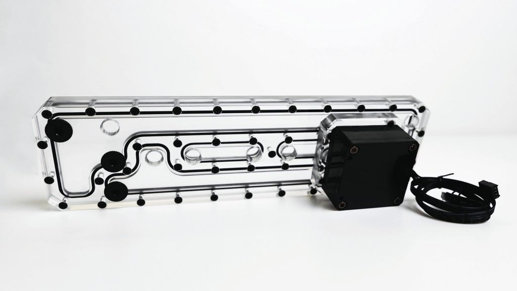 Für die Liebhaber der individuellen Kühlung hat HYTE die Y60 Distro Plate für die Eckverkleidung entwickelt. Die Y60 Distro Plate sitzt ebenfalls im Eckpanelschlitz des Y60 und zeigt den Durchfluss des Kühlmittels von vorne und in der Mitte an. Die Y60 Distro Plate ist sowohl mit D5- als auch mit DDC-Pumpen für eine Reihe von individuellen Kreisläufen kompatibel und verfügt über vier separate Durchflusskammern, die eine präzise Weiterleitung des Kühlmittels zwischen Kühlern und Wasserblöcken ermöglichen. Die Anschlüsse der Y60 Distro Plate sind für ein Dual-Radiator-Setup angeordnet, um sowohl die CPU als auch die Grafikkarte zu kühlen.