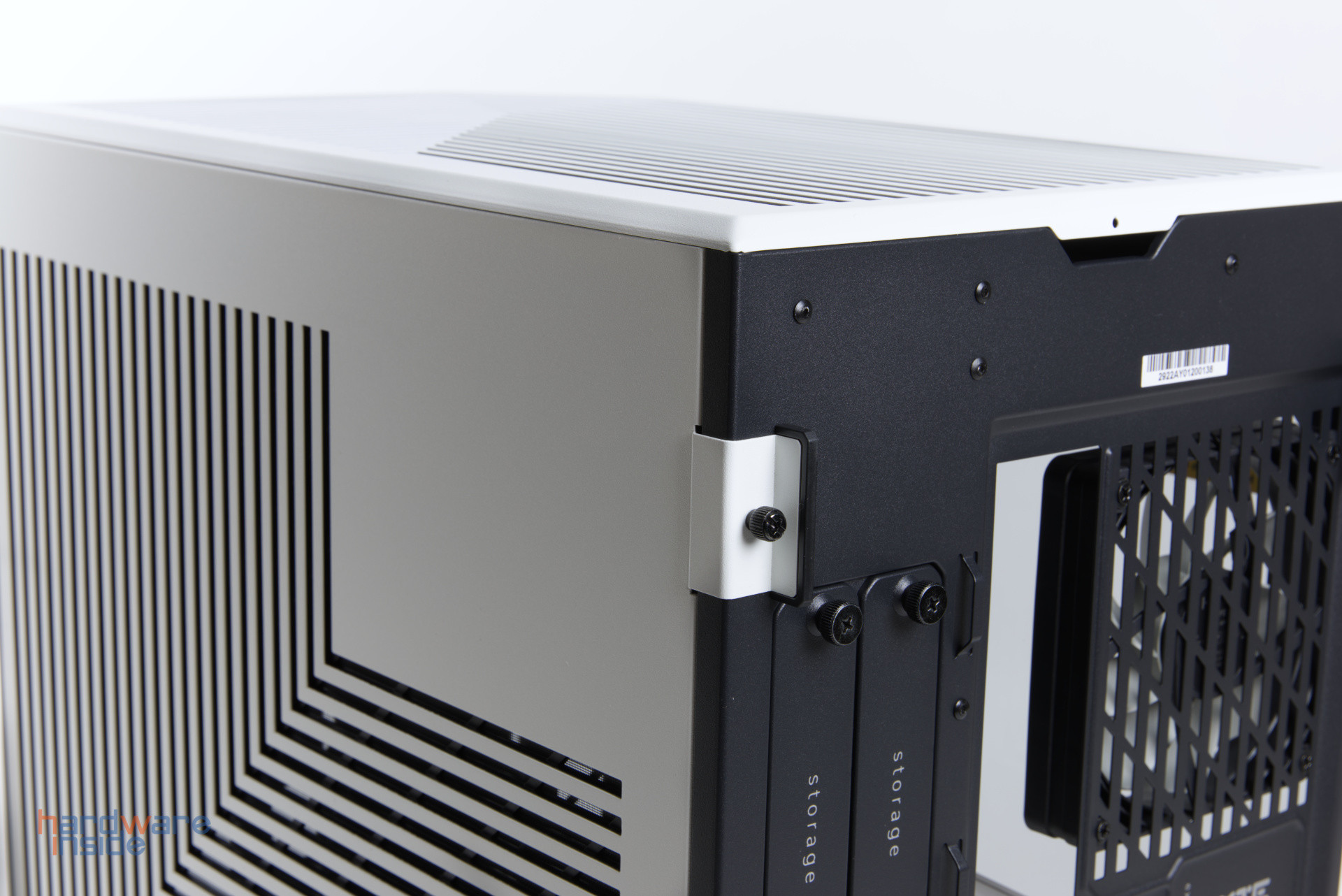 Am Heck befinden sich zwei Einschübe, auf denen sich zwei 2,5″ oder 3,5″ Festplatten montieren lassen. Die dazu passende Beschriftung „storage“ ist zwar unnötig, sagt optisch aber durchaus zu. Auch wird hier nochmal eindeutig klargestellt, dass die vertikale Montage der Grafikkarte nicht optional ist, sondern zwingend erfolgen muss. Daher liegt auch ein hochwertiges PCIe Riser 4.0 x 16 Kabel im Lieferumfang bei. Durch die Positionierung der Grafikkarte vor dem Mainboard, sind alle 7 Erweiterungsslots auf Low-Profile ausgelegt.