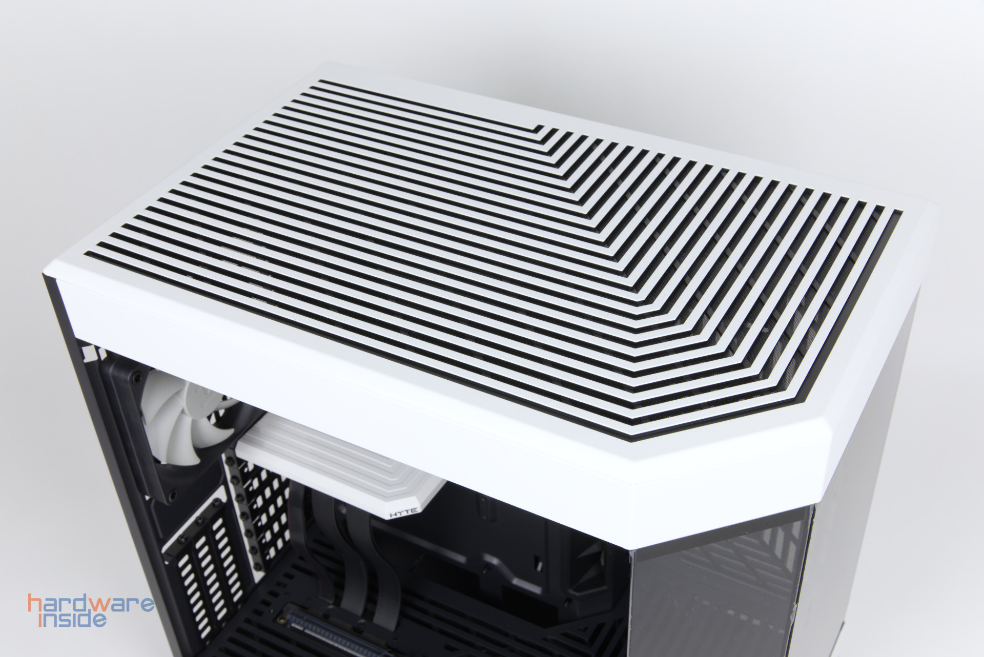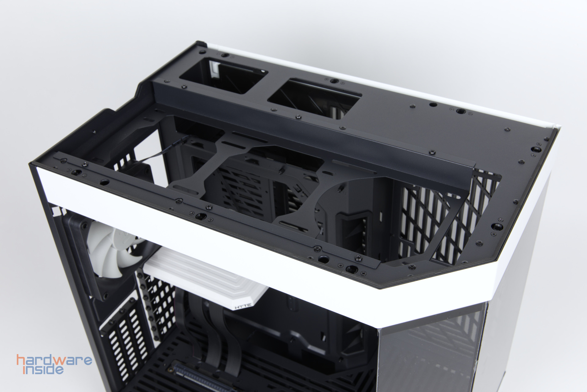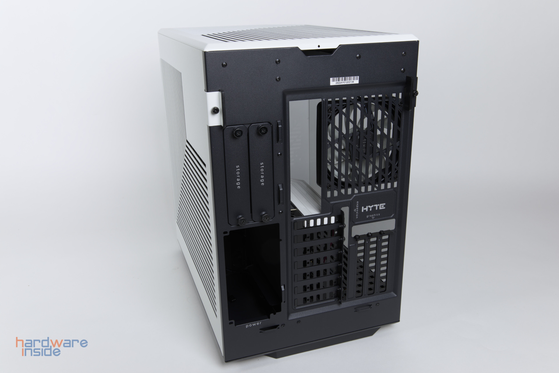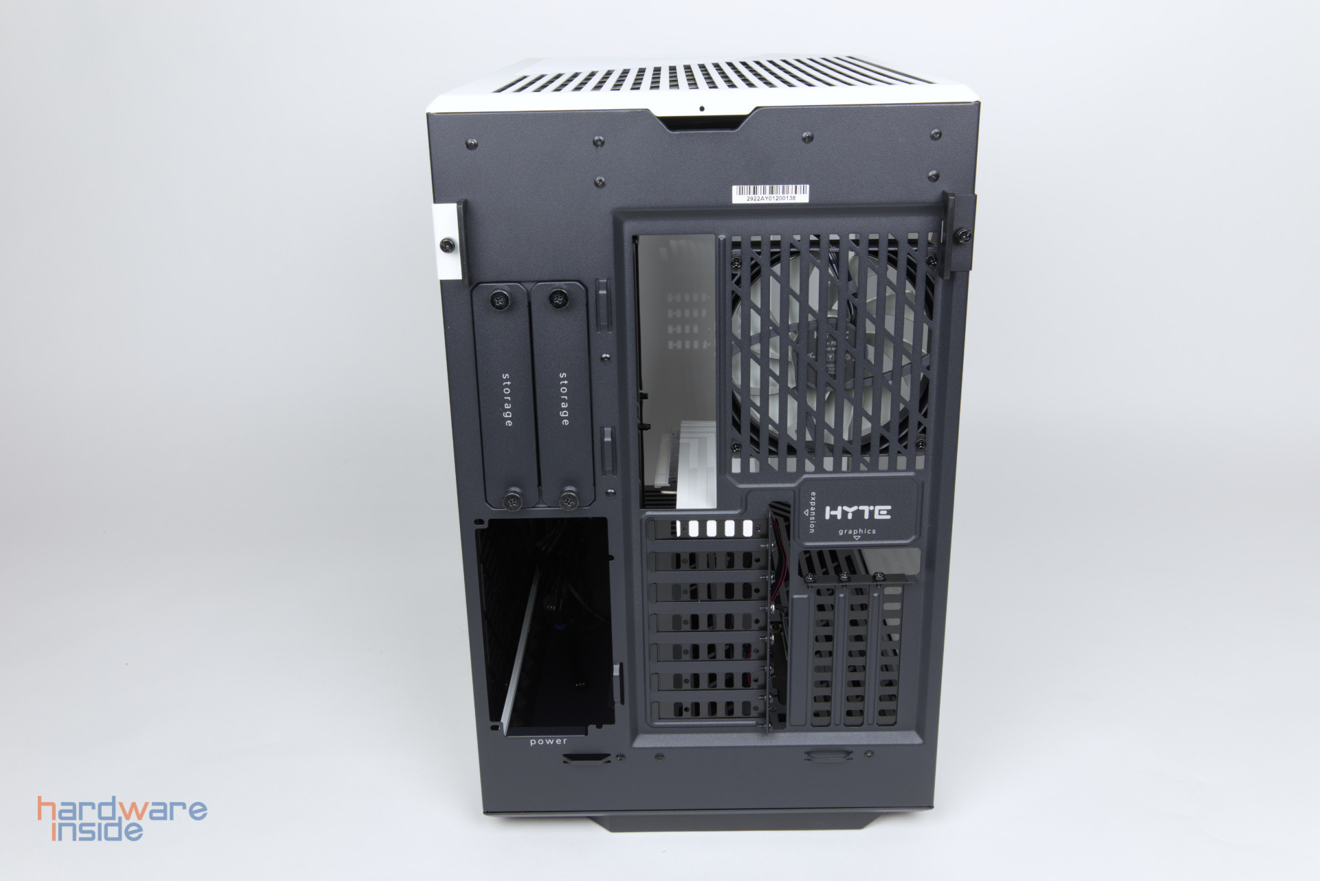 Im Inneren wird auf mehrere Kammern gesetzt, die zumindest optisch voneinander getrennt sind. Hinter dem Mainboardtray lassen sich ATX-Netzteile mit bis zu 235 mm Gesamtlänge verschrauben. Zusätzlich befinden sich hier die zwei möglichen 2,5″ oder 3,5″ Festplatten. Neben dem vorgesehenen Platz fürs Mainboard lassen sich zwei 120 oder 140 mm Lüfter verschrauben, auch ein Radiator mit bis zu 150 mm Dicke ist machbar. Hyte entwickelt gerade eine zum Gehäuse passende AiO, welche genau diesen Spielraum ausnutzen möchte.