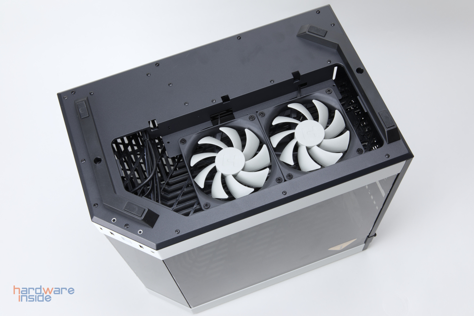 Die Filter bestehen aus Kunststoff und sind fest verbunden mit einer dünnen Platte aus Stahl. Unter dem Gehäusedeckel befindet sich eine Aussparung, dort lassen sich drei 120 mm Lüfter installieren. Diese Lüfter des Typ Flow FA12 setzen auf ein flüssigkeitsdynamisches Lager und liefern bis zu 1500 rpm. Da nur 3-Pin-Anschlüsse verwendet werden, ist eine Steuerung nur über die Spannung möglich.