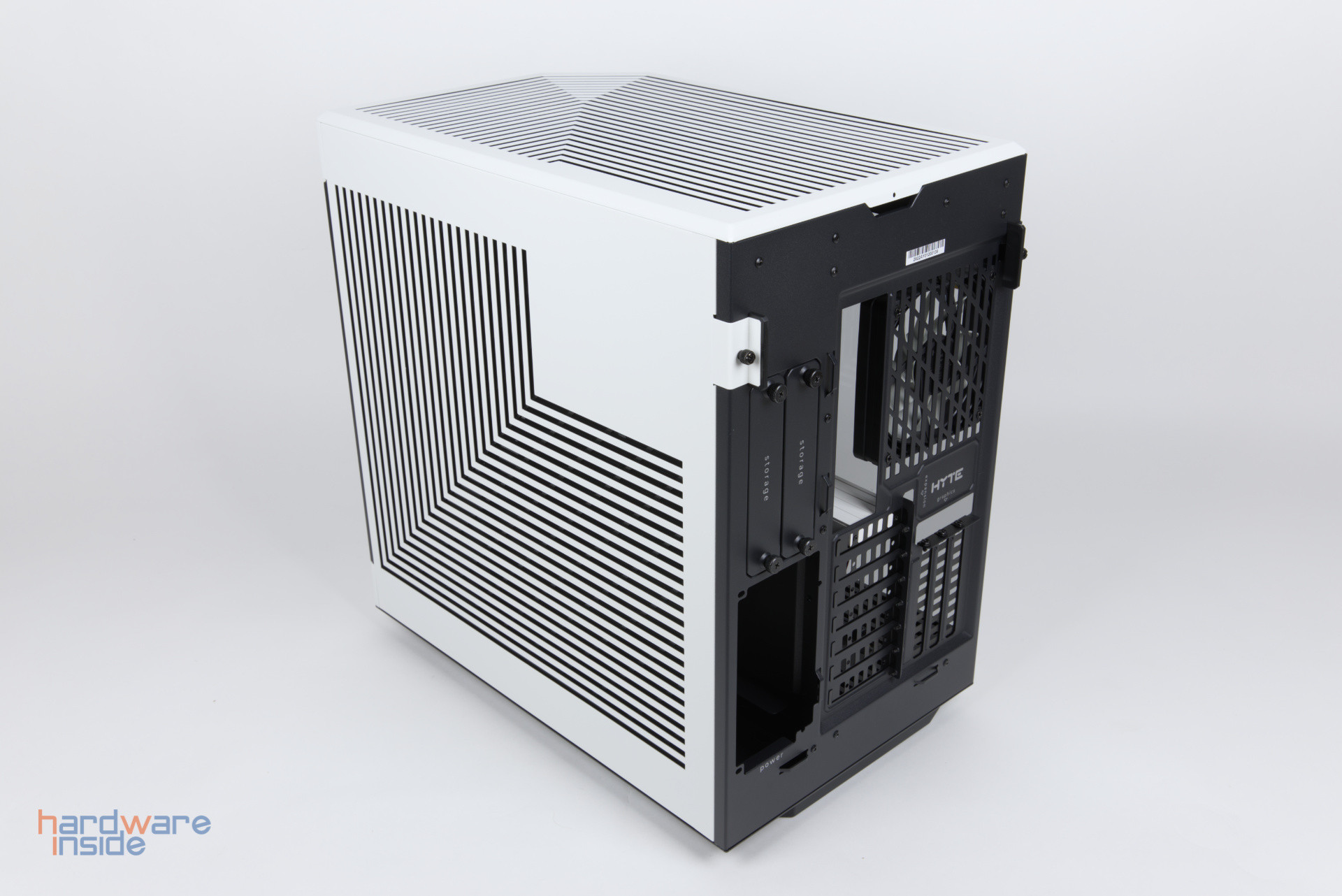 Getrennte Kammern, Panoramablick und ein eigenes Design bei den Lüftungsschlitzen. Eine hübsche Mischung aus weißen und schwarzen Elementen. Dazu die Möglichkeit, hinter der Scheibe an der Ecke ein Display zu montieren. Alles in allem könnte der Ersteindruck kaum besser sein. Gerade der uneingeschränkte Blick ins Innere durch die minimal getönten Scheiben hat es uns angetan. Mit 285 x 456 x 462 mm (B x H x T) ist das Gehäuse, gerade für ein E-ATX Modell mit 360 mm AiO-Option, als überschaubar groß einzuordnen. Die gesteigerte Breite im Vergleich zu normalen Midi-Towern muss dennoch bedacht werden, wenn das Gehäuse auf dem Schreibtisch stehen soll.