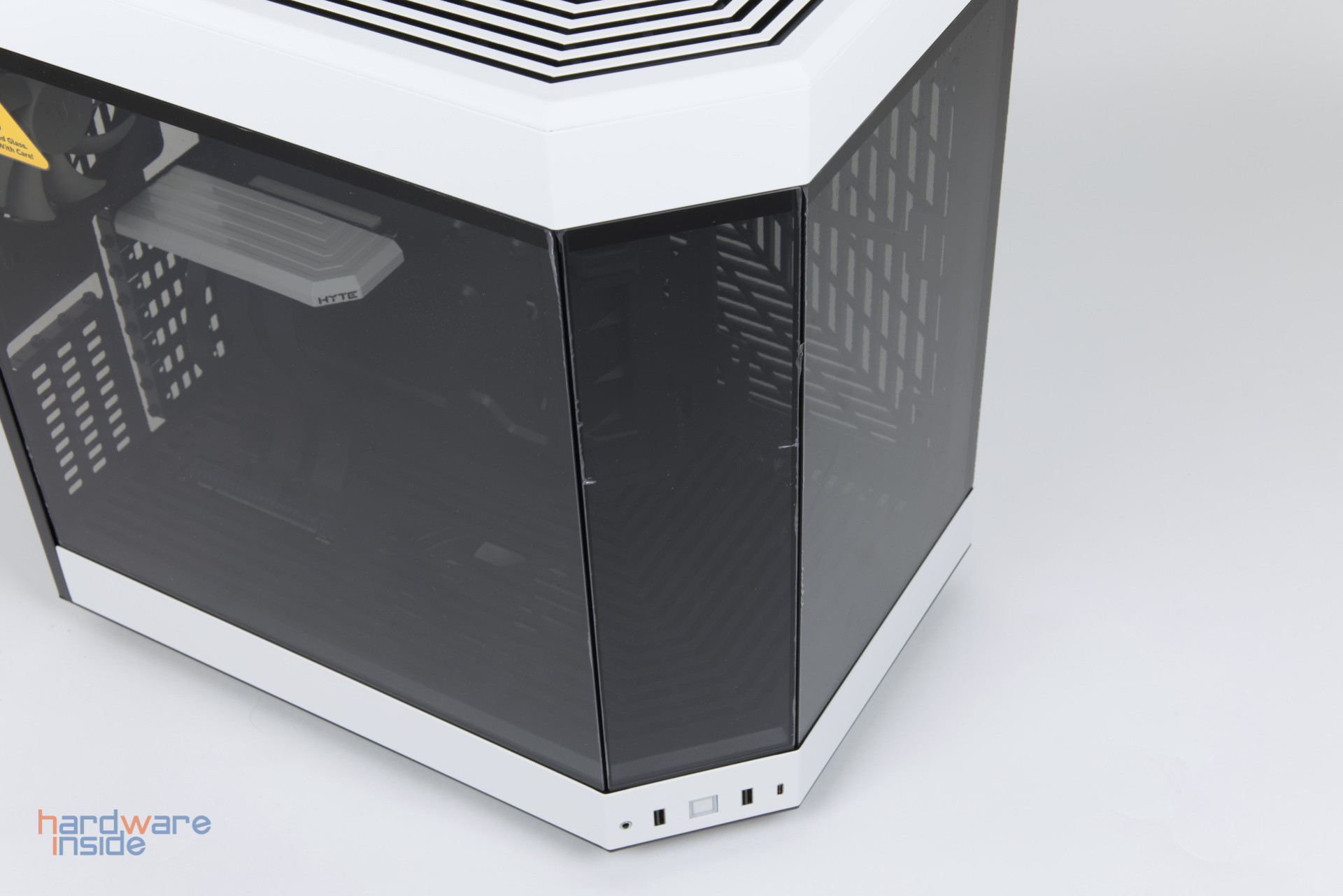 Unter dem an der Front befindlichen schmalen Glasstreifen befinden sich die Anschlüsse, worunter auch ein USB 3.2 Gen 2 Type-C zu finden ist. Durch den beigelegten Adapter können Mikrofon und Kopfhörer am vorderen 3,5 mm Klinkenport genutzt werden. Die Bodennähe der Ports ist dann kein Problem, wenn das Hyte Y60 auf dem Tisch platziert werden soll. Ist dem nicht so, kann sich diese Positionierung als ungünstig herausstellen. Bezieht man die Produktbilder des Y60 mit ein wird aber klar, welche Zielgruppe (Tisch vs. Boden) im Mittelpunkt der Planung stand.