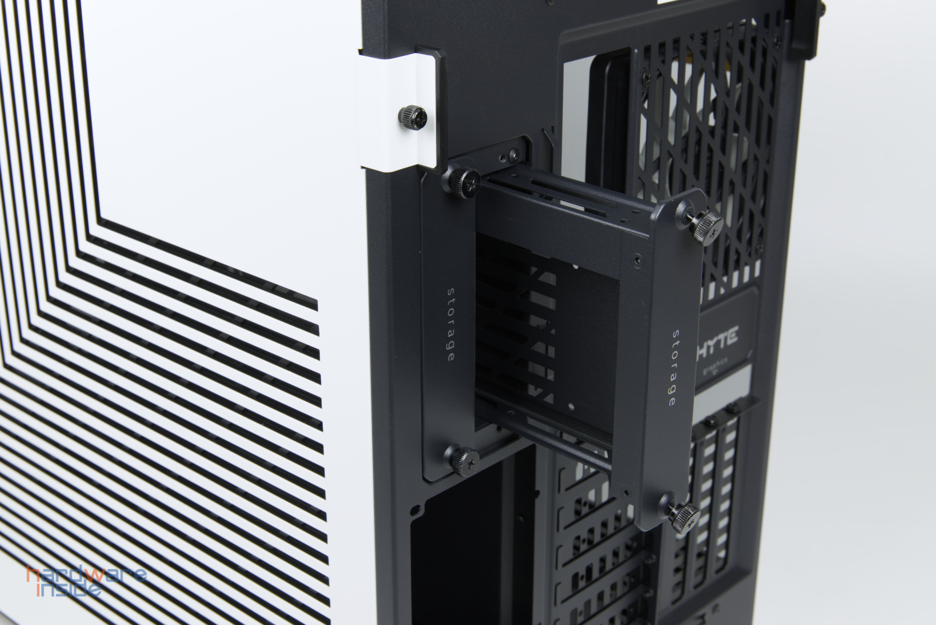 Im Inneren wird auf mehrere Kammern gesetzt, die zumindest optisch voneinander getrennt sind. Hinter dem Mainboardtray lassen sich ATX-Netzteile mit bis zu 235 mm Gesamtlänge verschrauben. Zusätzlich befinden sich hier die zwei möglichen 2,5″ oder 3,5″ Festplatten. Neben dem vorgesehenen Platz fürs Mainboard lassen sich zwei 120 oder 140 mm Lüfter verschrauben, auch ein Radiator mit bis zu 150 mm Dicke ist machbar. Hyte entwickelt gerade eine zum Gehäuse passende AiO, welche genau diesen Spielraum ausnutzen möchte.