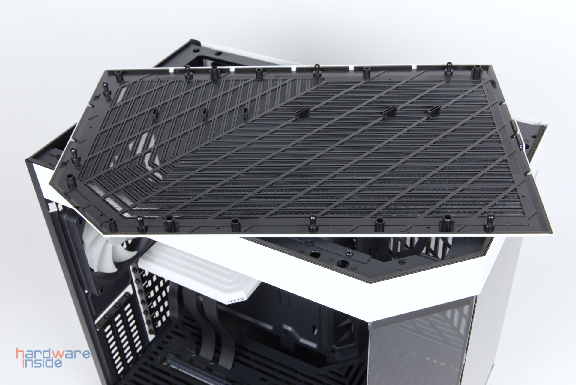 Die Filter bestehen aus Kunststoff und sind fest verbunden mit einer dünnen Platte aus Stahl. Unter dem Gehäusedeckel befindet sich eine Aussparung, dort lassen sich drei 120 mm Lüfter installieren. Diese Lüfter des Typ Flow FA12 setzen auf ein flüssigkeitsdynamisches Lager und liefern bis zu 1500 rpm. Da nur 3-Pin-Anschlüsse verwendet werden, ist eine Steuerung nur über die Spannung möglich.