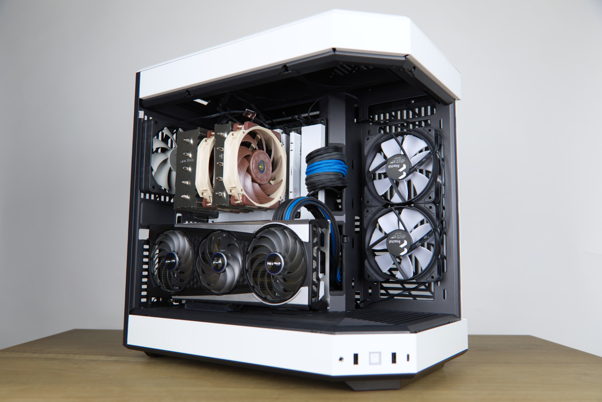 Damit die Kühlleistung etwas greifbarer dargestellt wird, setzen wir auf das Fractal Design Torrent Compact als Referenzgehäuse. Dabei handelt es sich um eines der leistungsfähigsten Airflow-Gehäuse auf dem Markt, den Test dazu findet ihr hier. Die Lüfter unseres Noctua NH-D12L stellen wir fest auf 1000 rpm, die Lüfter der Grafikkarte auf 50 % der möglichen Laufleistung. Das verhindert die Einflussnahme der automatischen Lüftersteuerung auf die Messergebnisse. Die Lüfter des Hyte Y60 laufen auf voller Drehzahl. Die am Boden befindlichen Lüfter werden testweise an der Seite angebracht, da große Unterschiede im Airflow zu erwarten sind.