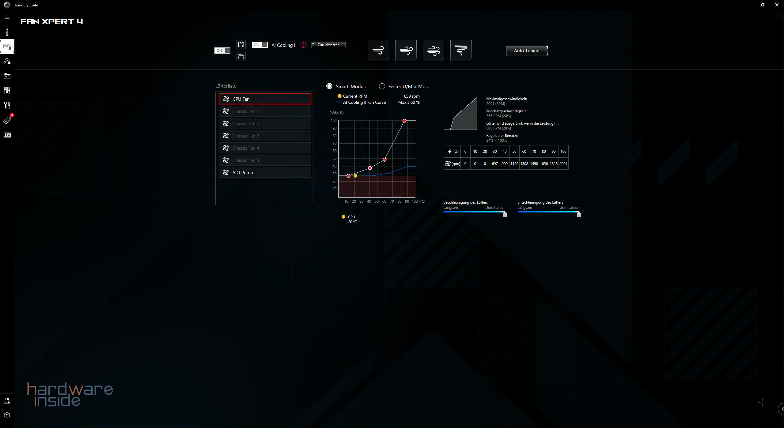 Bei einem Vorab-Test ergab sich für den Low-Noise Bereich der min. Wert von 566 RPM / 24 % bei den Lüftern, der uns seitens der Software (Theoretischer Wert) vorgegeben wurde. Der manuell einstellbare Bereich lag zumindest auf unserer Testplattform ab 655 RPM, alles unterhalb war nicht machbar. Der regelbare Bereich via Software liegt bei 24 % – 100 %. Für die weiteren Messwerte wird die Drehzahl auf 50 % und 100 % erhöht.