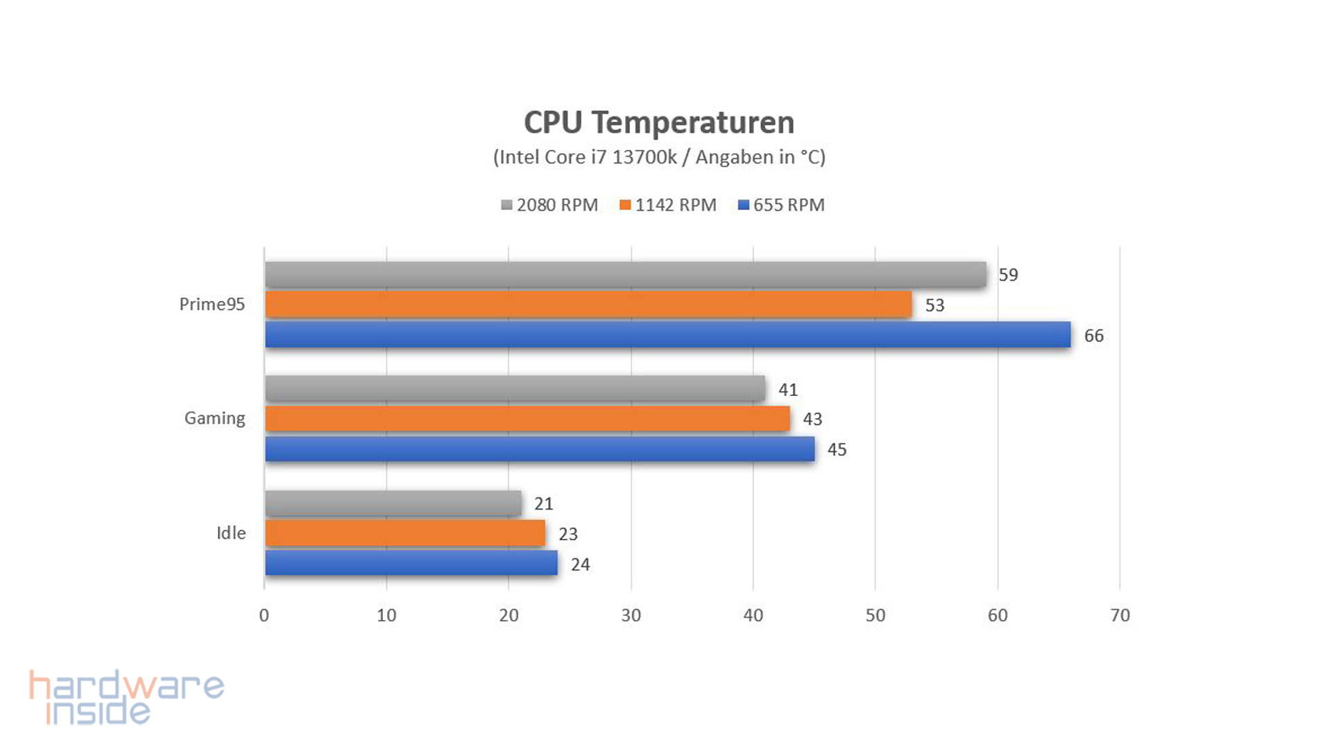 Wie im Diagramm zu ersehen ist, sind die ausgelesenen 24 °C laut dem Tool HardwareInfo im Idle doch schon beachtlich. Beim Gaming wurde darauf geachtet, dass eine ausreichende Kühlleistung, aber zugleich kein Aufheulen der verbauten Lüfter auftritt. Mit maximal 45 °C und das im Low-Noise Bereich kann der Lüfter trumpfen. Zu guter Letzt wurde die max. Drehzahl von 2080 RPM eingestellt und Prime95 kam wie oben bereits erwähnt, zum Einsatz. Mit 66 °C im Low-Noise Bereich bei 655 RPM und sehr guten 59 °C bei max. Drehzahl können die verbauten IceGALE ARGB 120 mm Lüfter auch hier punkten. Man darf nicht vergessen, es handelt sich hier eigentlich um Gehäuselüfter.