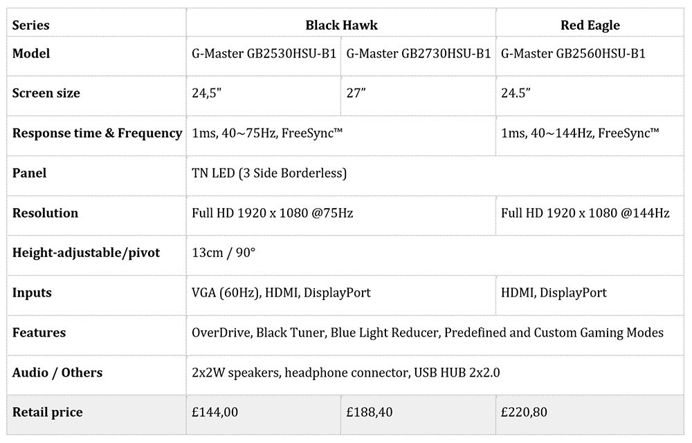 Die neuen Black Hawk Modelle sind ein 24,5 “ G-Master GB2530HSU-B1 und ein 27 “ G-Master GB2730HSU-B1. Beide bieten eine beeindruckende Reaktionszeit von 1 ms und eine Bildwiederholfrequenz von 75 Hz.
