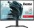 Auch auf der Rückseite setzt sich das schlichte Design weiter fort. Im oberen Bereich ist erneut ein großer Iiyama Schriftzug zu sehen. Auf der linken Seite hat Iiyama die Bedienelemente untergebracht. Die fünf Tasten sind ebenfalls mit einer weißen Beschriftung versehen. Über die Tasten wird der Monitor ein- und ausgeschaltet, es kann auch die Eingangsquelle gewählt und das Menü bedient werden. Da man beim Betätigen der Tasten um den Monitor herumgreifen muss, kann sich die Bedienung als schwierig erweisen, besonders beim Einsatz mehrerer Monitore.