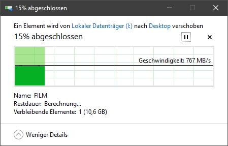 Unser System ist auf der XPG GAMMIX S11 Pro M.2-SSD installiert. Wir kopieren nun eine über 10 GB Große Videodatei vom Inateck FE2101 auf unsere M.2 SSD im Rechner. Dabei erreichen wir Übertragungsgeschwindigkeiten von durchschnittlich 767 MB/s. Der ganze Kopiervorgang dauert nicht einmal eine Minute.