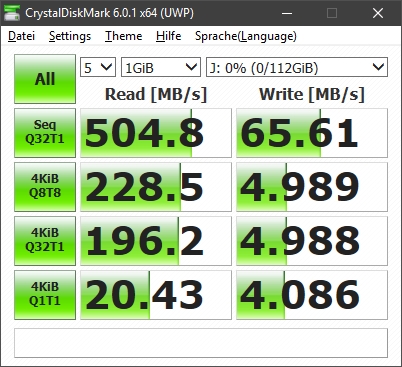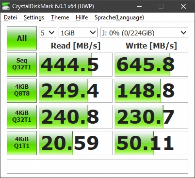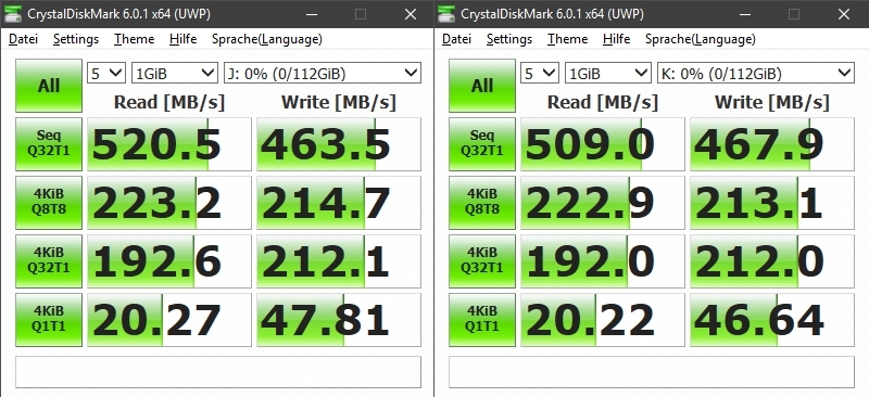 Natürlich kann das Gehäuse auch ohne Raid-Verbund betrieben werden. Schalten wir beide Schalter auf die Stellung „Off“ so bekommen wir beide Laufwerke, welche auch beide unabhängig voneinander arbeiten und auch die Geschwindigkeit erreichen, die Kingston angibt.