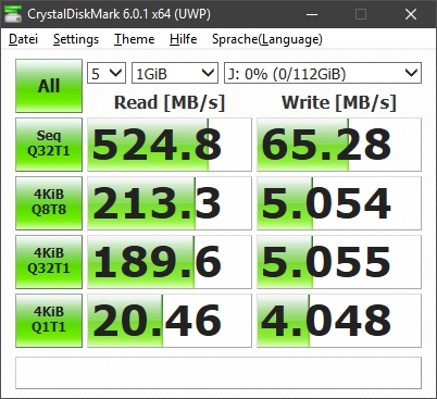 Für unseren Test verwenden wir zwei Kingston A400 SSDs mit einer Kapazität von jeweils 120 GB. Diese SSDs erreichen, wenn sie in einem Computer intern an SATA3 angeschlossen sind eine Lesegeschwindigkeit von 520 MB/s und eine Schreibgeschwindigkeit von 470 MB/s. Damit arbeiten die SSDs etwa 20 MB/s schneller als von Kingston angegeben. Es reicht die Laufwerke einfach in das Innenleben des Inateck FE2101 einzuschieben, ein zusätzliches Verschrauben ist nicht zwingend notwendig. Wir schließen das externe Gehäuse mit dem mitgeliefertem USB Typ-C Datenkabel an den entsprechenden USB Typ-C Anschluss unserer Systems an.