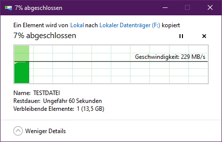 Wir übertragen eine 14,5 GB große Datei von unserer Festplatte auf die nun externe SSD. Dabei erreichen wir in der Spitze eine Übertragungsgeschwindigkeit von 229 MB/s. Die Geschwindigkeit sinkt zwischenzeitlich auch auf 60 MB/s ab, daher kann die von Windows 10 geschätzte Restdauer der Übertragung nicht ganz gehalten werden. Immerhin brauchen wir für das kopieren der recht großen Datei keine zwei Minuten.