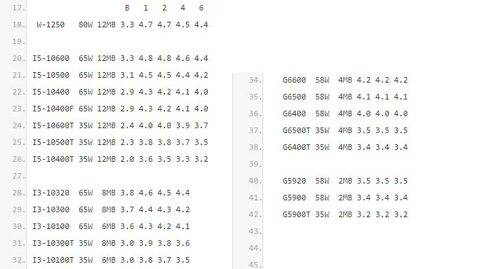 Die Datei listet eine Reihe von Comet Lake CPUs auf, die in die Core i5 und Core i3 Familien unterteilt sind, sowie mehrere Pentium Class Prozessoren und einen Workstation-Chip. Dies ist jedoch kein allumfassendes Lineup. Insbesondere fehlen Core i7- und Core i9 CPUs.