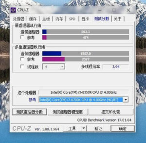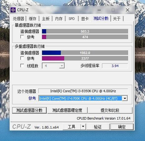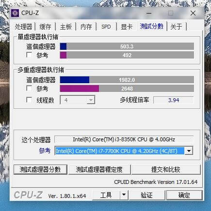 Der Intel Core i3-8350K ist Intels erste Vier-Kern-CPU mit i3 Einstufung. Einige Leaks zeigen den Prozessor im Test mit CPU-Z und AIDA64. Wir möchten euch diese Screenshots nicht vorenthalten. Soweit wir sehen, erreicht der i3-8350K, 503.3 Punkte im CPU-Z Single-Thread-Test. Im Multi-Thread erreicht die CPU 1982.0 Punkte. Angesichts der Resultate erreicht der i3 bessere Werte als ein i7-7700k. Verrückt ist, dass der i3 bei 4.0 GHz taktet während der i7 mit einem 4.7 GHz Boost arbeitet. Dieser ist auch schneller als der i7-6700k.