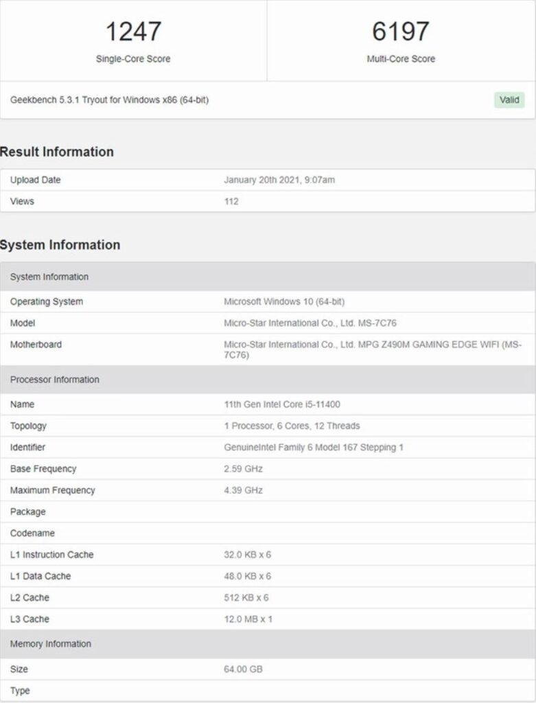 Eines der neuesten Leaks zeigt die Leistung eines Intel Core i5-11400-Prozessors der 11. Generation, gepaart mit einem MSI MPG Z490M Gaming Edge WiFi-Motherboard und 64 GB DDR4-Speicher.