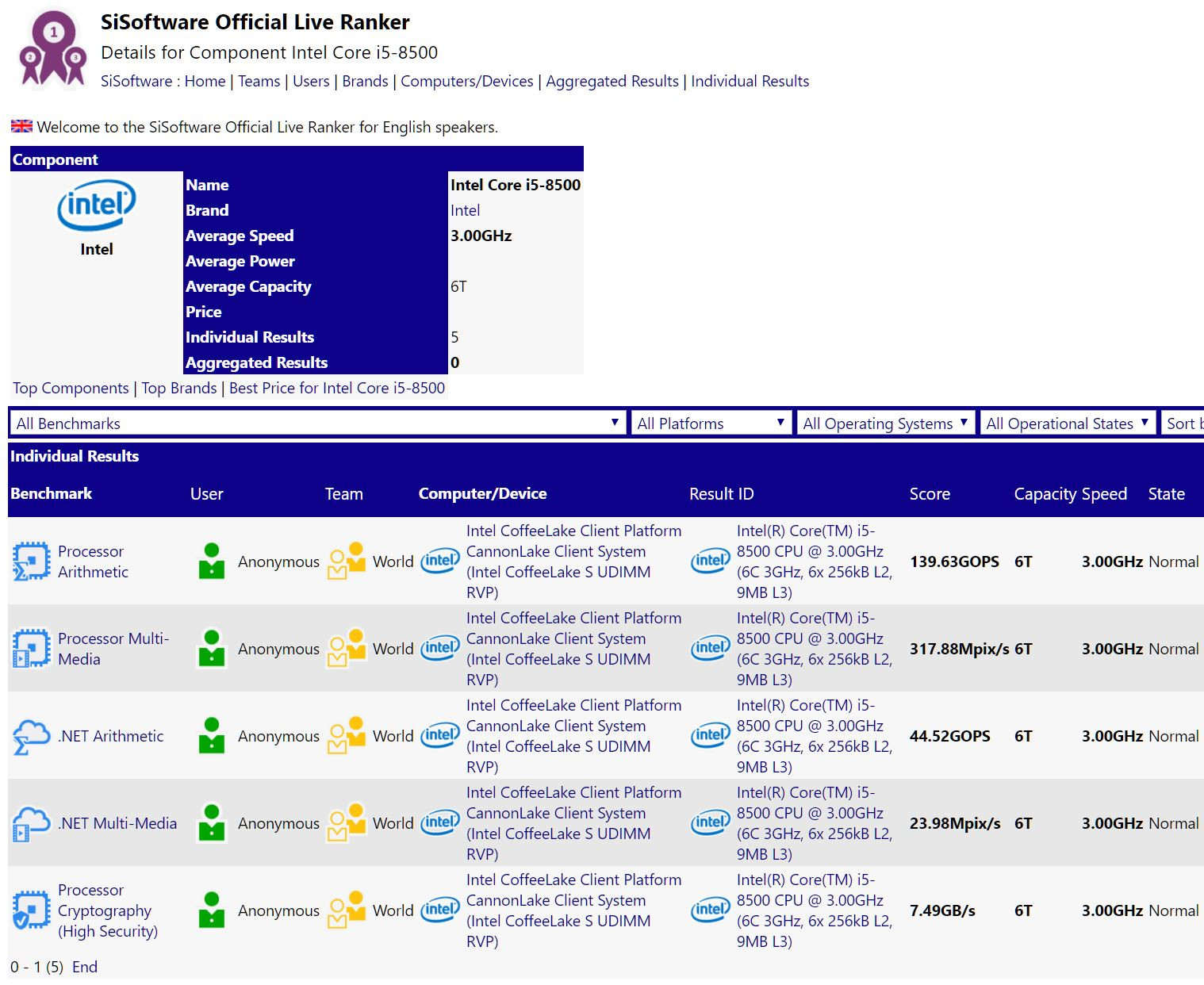 Der Core i5-8500 kommt mit einer psychologisch angenehmen 3,00 GHz nominalen Taktrate (während der i5-8400 einen Sub-3 GHz-Takt von 2,80 GHz hat). Der Datenbankeintrag zeigt keine Turbo-Boost-Takte, aber da der i5-8400 mit einer Boost-Frequenz von 4,00 GHz kommt, kann man davon ausgehen, dass der i5-8500 4,20-4,30 GHz hat. Der 6-Core- / 6-Thread-Chip verfügt über 9 MB gemeinsamen L3-Cache und eine TDP-Leistung von 65 W. Im Arithmetiktest erreichte er 139,63 GOPS, im Multimediatest 317,88 Mpix / s, im Kryptographietest 7,49 GB / s, was seine Leistung in die Liga der AMD Ryzen 5 1600 bringt.