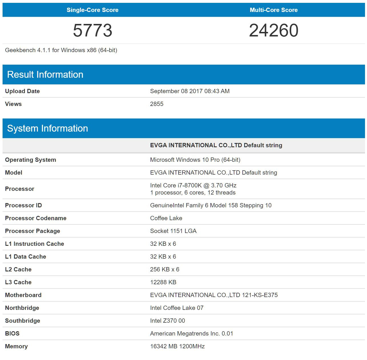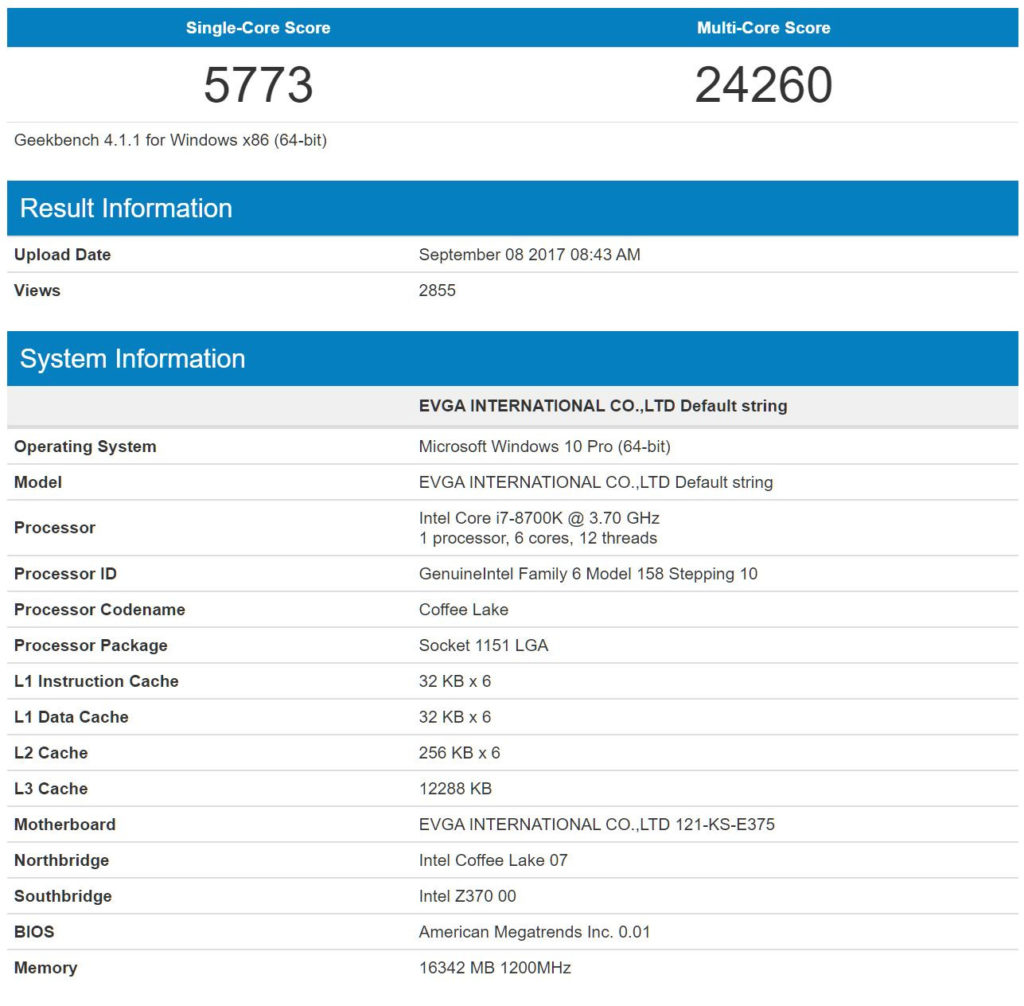 ntels 8. Generation der „Coffee Lake“ Prozessoren rückt immer näher an ihren Start am 5. Oktober. Doch schon jetzt landet ein Bench des i7-8700K auf Geekbench. Der Sechskerner läuft unter einem Z370 Chipsatz von EVGA (Modellcode: 121-KS-E375).