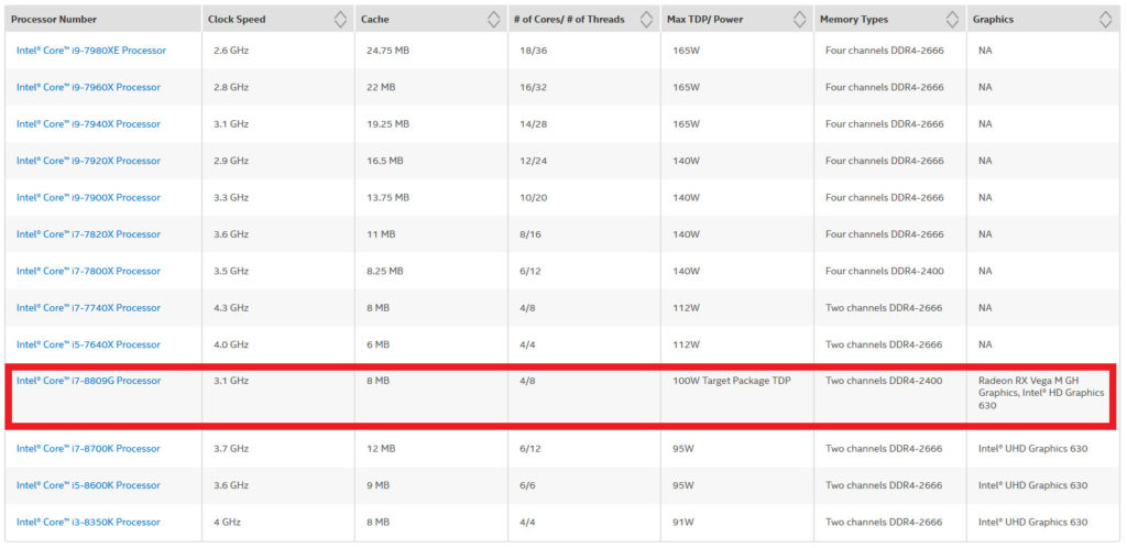 Intel hat auf seiner Website Spezifikationen für das kommende Multichip-Modul „Kaby Lake + AMD Vega“, den Core i7-8809G, veröffentlicht. Einige dieser Spezifikationen wurden bereits von Futuremark SystemInfo herausgefiltert. Im Mittelpunkt der Website steht jedoch ein weiteres wichtiges Feature, nämlich die Dual Integrated Graphics. Das Datenblatt bestätigt, dass der Chip einen 4-Core/8-Thread „Kaby Lake“-CPU-Die mit einem AMD Radeon RX Vega M GH-Grafik-Chip kombiniert. Die CPU wird mit 3,10 GHz getaktet und die Turbo-Boost-Frequenz soll bis zu 3,90 GHz leisten. Der L3-Cache ist auf 8 MB begrenzt. Der Referenzspeichertakt wird auf den Zweikanal-DDR4-2400 eingestellt. Darüber hinaus verfügt die CPU über einen freigeschalteten Basis-Clock-Multiplikator.