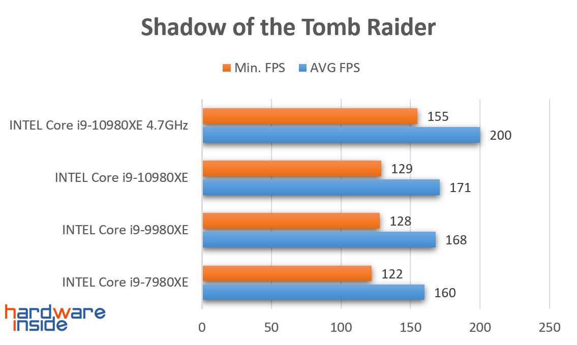 In Shadow of the Tomb Raider betrachten wir die Frames beim CPU-Test des INTEL Core i9-10980XE. Hierbei erkennen wir, dass ein höherer CPU-Takt deutliche Unterschiede ausmacht. Mit OC des i9-10980XE erreichen wir deutlich mehr Frames als ohne. Wir müssen aber auch darauf hinweisen, dass der Einfluss des Prozessors auf die Frames im Spiel kaum einen Unterschied macht. So haben wir uns mit allen vier Konfigurationen im Durchschnitt zwischen 106 und 107 FPS bewegt.