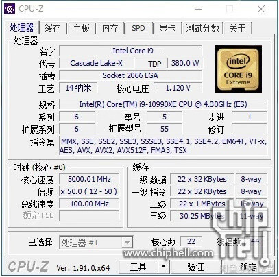 In den CPU-Z-Screenshots als Core i9-10990XE bezeichnet, basiert der Prozessor auf der „Cascade Lake-X“ Mikroarchitektur und verfügt über die gleichen I/Os wie der i9-10980XE, wenn man sich die Befehlssätze ansieht. Er hat 22 Kerne und HyperThreading ermöglicht 44 Threads. Cache-Hierarchie und Ausgewogenheit sind charakteristisch für „Cascade Lake“, mit 1 MB dediziertem L2-Cache pro Kern und 30,25 MB gemeinsam genutztem L3-Cache. Der I/O ist wahrscheinlich identisch mit dem i9-10980XE, da dies eine Funktion der Plattform und des Sockels ist. Was interessanter ist, sind die Taktraten. Der Namensstring des Engineering-Beispiels bezieht sich auf eine nominale Taktfrequenz von 4.00 GHz, und im Screenshot ist der Chip mit 5.00 GHz (mindestens auf einem Kern) dargestellt. Es gibt auch einen Performance-Benchmark, der mit dem Leck einhergeht, möglicherweise CineBench R20 nT. Hier wird der i9-10990XE gezeigt, der 14.005 Punkte erzielt, was im gleichen Bereich liegt wie der 24-Kern Ryzen Threadripper 3960X.