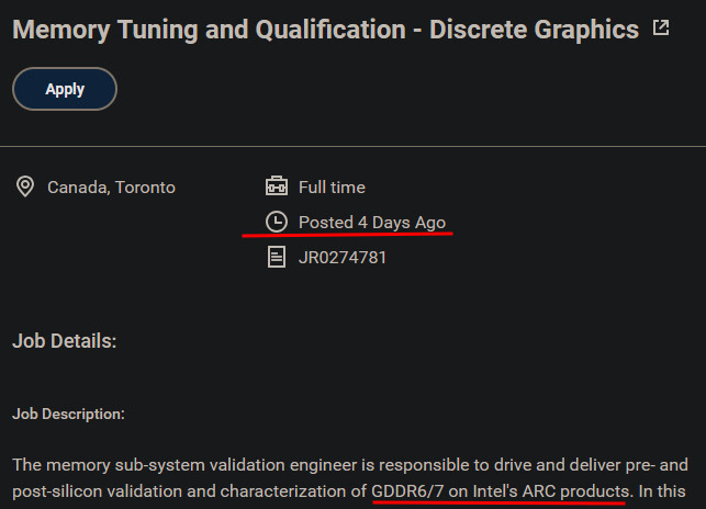 Ein aktuelles Stellenangebot bei Intel für einen „Memory Sub-System Validation Engineer“ – also eine Fachkraft, die neue Speichertypen mit Prototypen-Silizium testet und validiert – deutet darauf hin, dass Intel die moderne GDDR7-Speichertechnologie in einer kommenden GPU-Generation einsetzen will. In der Ausschreibung heißt es, es gehe um die Vor- und Nachsilizium-Validierung sowie Charakterisierung von GDDR6- und GDDR7-Speichertypen auf Arc-GPU-Produkten von Intel.