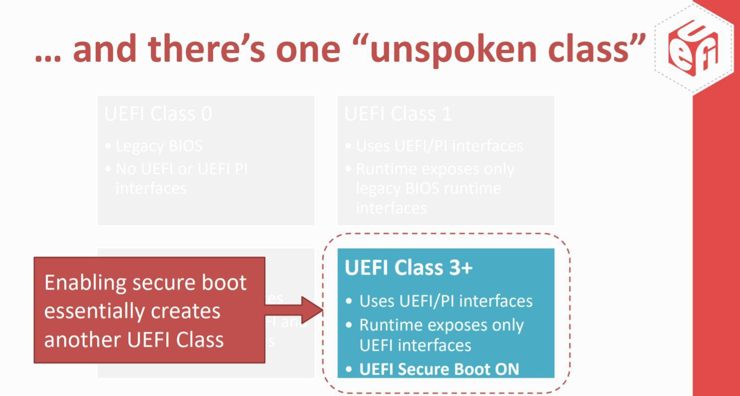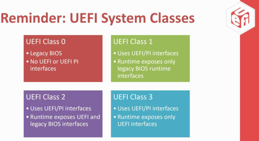 Den im Jahr 2020 erscheinenden Client- und Unternehmensplattformen des Unternehmens fehlt das CSM (Kompatibilitätsunterstützungsmodul), eine Komponente, die UEFI-unbewusste Betriebssysteme ermöglicht. Bootfähige Geräte laufen auf neueren Systemen mit UEFI. Geräte ohne dieses Kompatibilitätsunterstützungsmodul werden mit „UEFI Class 3“ benannt, da diese nur UEFI- oder UEFI-PI-Schnittstellen zur Verfügung stellen.