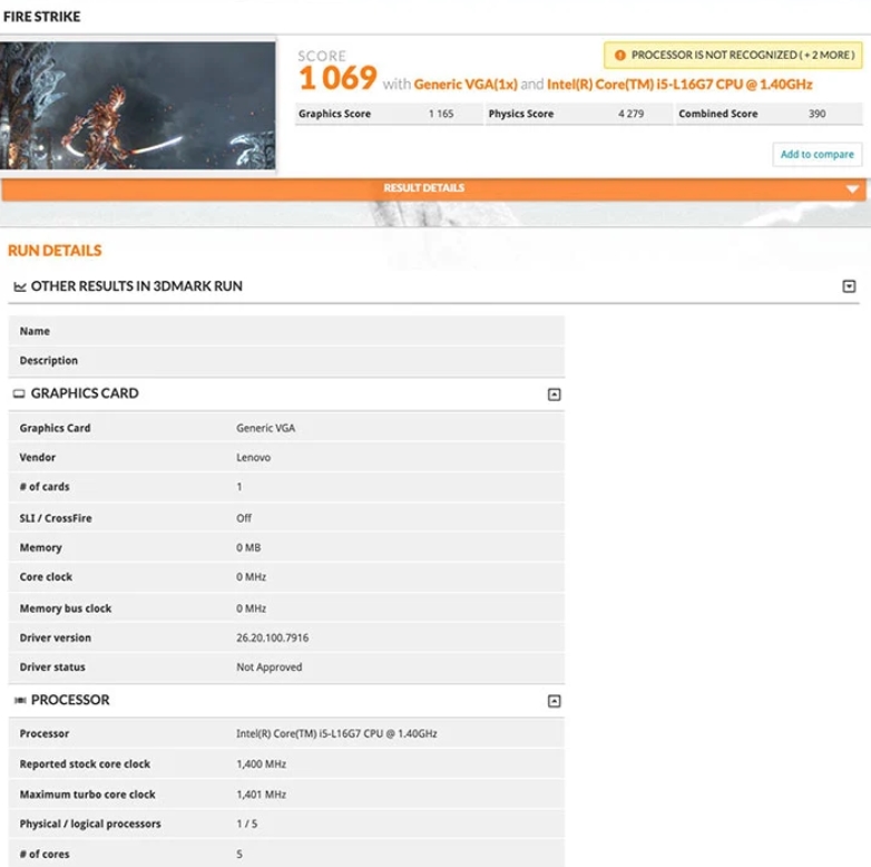Dieses Mal ist der Lakefield in einer Art Lenovo-System eingebettet. Im Fire Strike-Benchmark erzielte er eine Gesamtpunktzahl von 1.069, eine Grafik-Punktzahl von 1.165 und eine kombinierte Punktzahl von 390.
