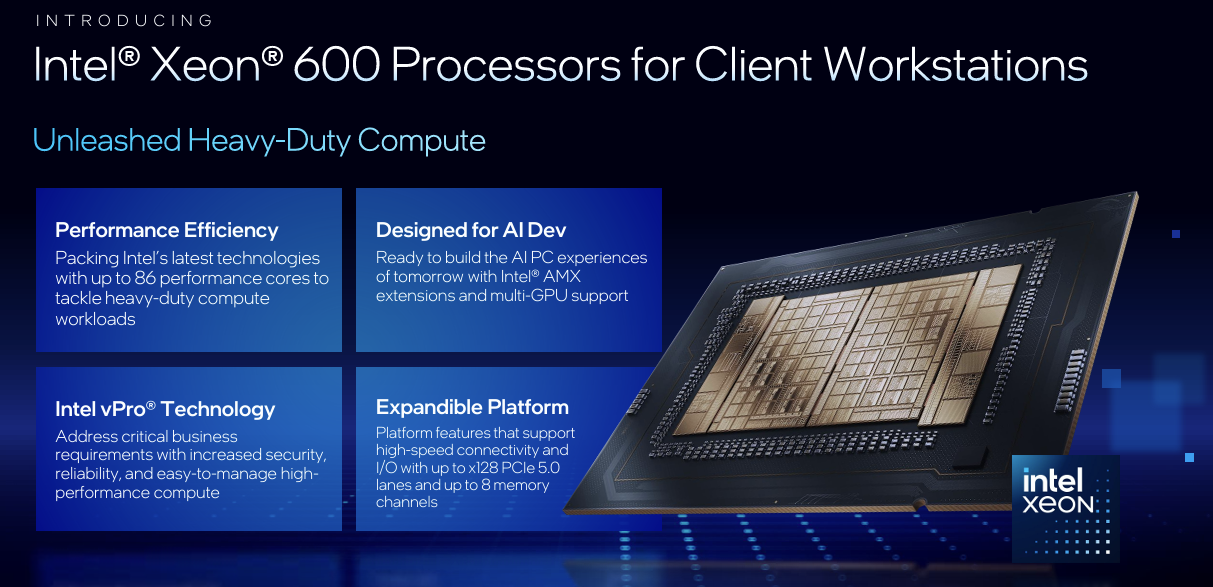 Intel hat seine neue Xeon-600-Serie für Workstations präsentiert. Die Prozessoren basieren auf der Granite-Rapids-Architektur und reichen preislich von rund 500 bis 7.699 US-Dollar. Sie ersetzen die bisherigen Xeon-W-2500- und W-3500-Reihen durch eine einheitliche, skalierbare Plattform.