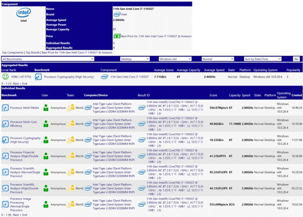 Die Ergebnisdatenbank von SiSoft SANDRA wurde heute Morgen mit einer Reihe von Benchmark-Ergebnissen der 11. Gen Core i7-1165G7 (4C / 8T) aktualisiert. Es liegen Ergebnisse für eine Reihe von SANDRA’s Benchmarks vor, darunter einige Tests in den Bereichen Kryptographie, Bildverarbeitung sowie finanzielle und wissenschaftliche Analyse. Für die meisten von ihnen liegen uns leider keine relevanten, hausinternen Zahlen zum Vergleich vor. Für das Prozessor-Multimedia-Ergebnis liegen uns jedoch vergleichbare Daten für einen Ice Lake-basierten Core i7-1065G7 vor, auf dem sowohl 15W- als auch 25W-TDP-Konfigurationen laufen.