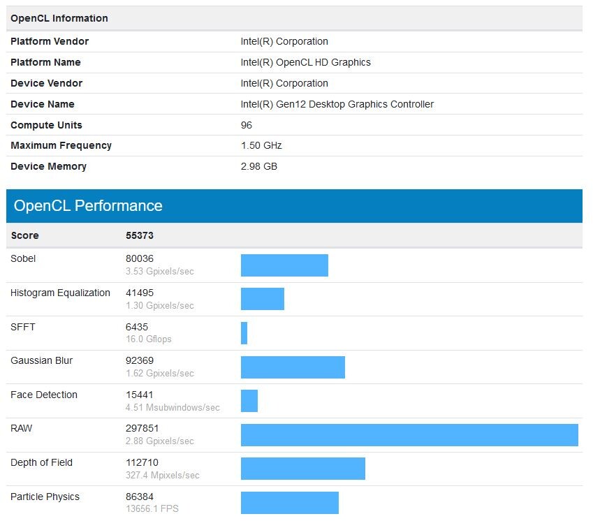 Der Geekbench-Lauf deckt nur die OpenCL-Leistung des ausgewählten Geräts ab: „Intel(R) Gen12 Desktop-Grafikcontroller“. Die Gesamtpunktzahl beträgt 55373 Punkte, mit 3,53 Gpixel/s bei „Sorbel“, 1,30 Gpixel/s bei der Histogramm-Entzerrung, 16 GFLOPs bei SFFT, 1,62 GPixel/s bei Gaussian Blur, 4,51 Msubwindows/s bei der Gesichtserkennung, 2,88 Gpixel/s bei RAW, 327,4 Mpixel/s bei DoF und 13656 FPS bei der Partikelphysik. Diese Werte entsprechen in etwa den 11 CU Radeon Vega iGPU, die in AMD „Picasso“ Ryzen 5 3400G Prozessoren gefunden wurden.