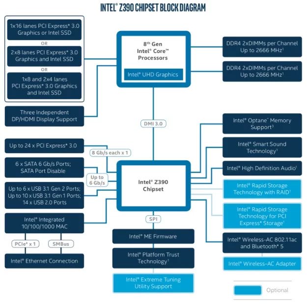 Diese neuen Prozessoren der 9. Generation sollen zusammen mit Intels kommendem Z390-Chipsatz auf den Markt kommen. Einem aktuellen Gerücht zufolge könnte der Z390 ein Rebrand des bestehenden Z370-Chipsatzes sein oder auch nicht. Wenn Intel nicht die Rebrand-Route geht, bringt das Z390 native 802.11ac Wi-Fi- und Bluetooth 5.0-Konnektivität mit sich.