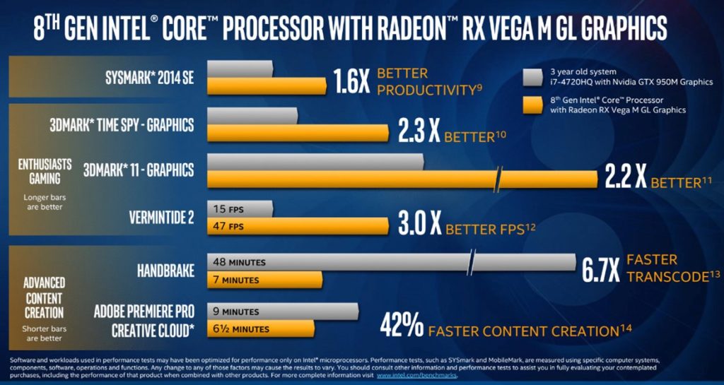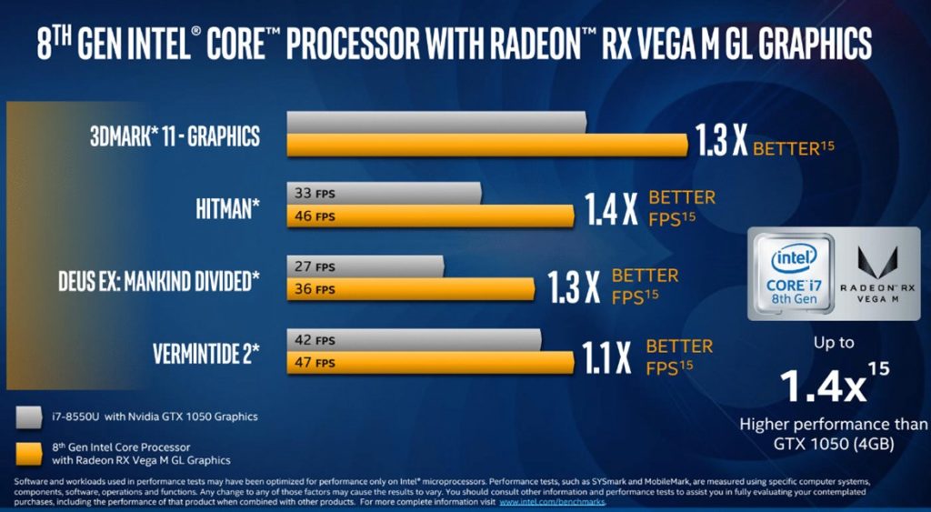 Aber natürlich möchte jeder wissen, wie diese Prozessoren im Vergleich zu einem traditionellen Intel Core Prozessor mit diskreter Grafik funktionieren werden? Generation Core i7 mit Radeon RX Vega M GL-Grafik ist laut Intel bis zu 1,4x schneller als ein Core i7-8550U mit NVIDIA GeForce GTX 1050 GPU in einem Notebook-System. Auf der Desktop-Seite ist ein Core i7 der 8. Generation mit Radeon RX Vega M GH Grafik bis zu 1,13x schneller als ein Core i7-7700HQ mit GeForce GTX 1060.