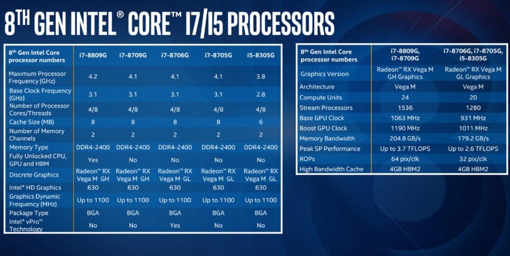 Die 100W-Desktop-Prozessoren fahren mit einem maximalen Boost leicht auf 4,2GHz, während die Basis-/Boost-Frequenzen des Radeon RX Vega M GH GPUs auf 1063MHz bzw. 1190MHz takten. Der Grafikprozessor wird außerdem mit 24 Recheneinheiten, 64 Pixel/Takt und 204 GB/s Speicherbandbreite aufgerüstet.