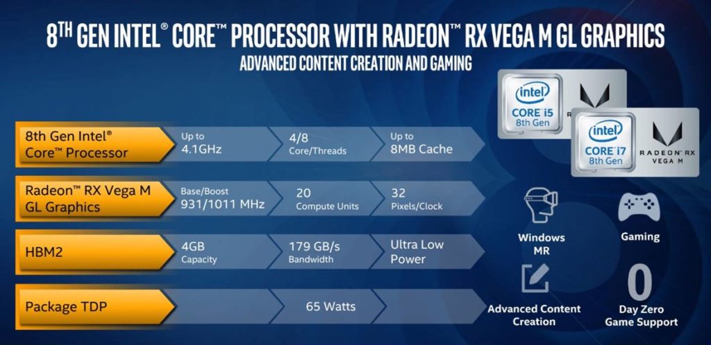 Die 65W-Mobilprozessoren können bis zu 4,1GHz leisten, während der Radeon RX Vega M GL GPU Base/Boost Clocks von 931MHz bzw. 1011MHz besitzt. Der Grafikprozessor verfügt über 20 Recheneinheiten mit 32 Pixeln/Takt, während die Speicherbandbreite bei 179 GB/s angesiedelt ist.