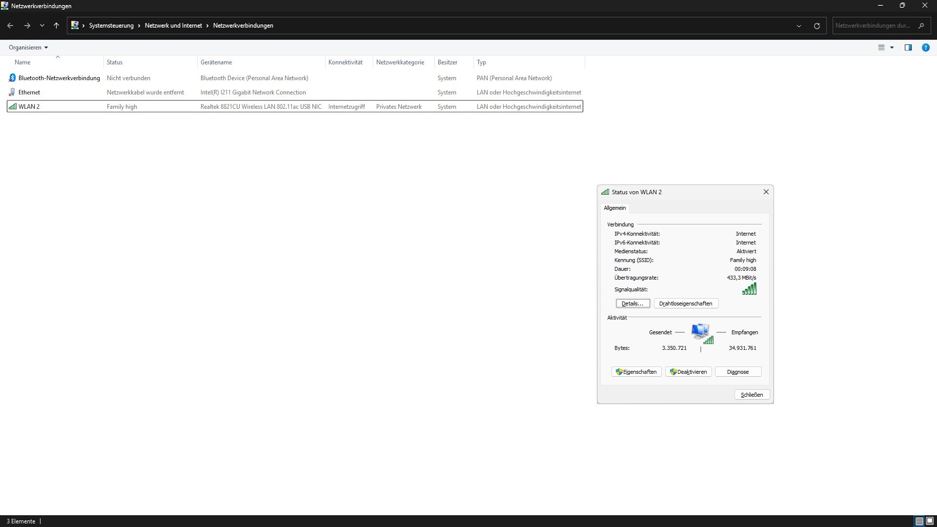 Wie es der Name des Inter-Tech Argus EP-119 WiFi 5 Adapters bereits verrät, beherrscht diese lediglich WiFi 5, dies ist in diesem Fall aber kein Problem, da das derzeitige WLAN-Netzwerk ohnehin nur ein WiFi 5 Netzwerk bereitstellt. In den letzten beiden Bildern fällt auf, dass die Geschwindigkeit nur bei 433 Mbit/s statt den versprochenen 600 Mbit/s liegt. Dies ist darin begründet, dass die Hersteller lediglich die Brutto-Datenrate angeben – was eigentlich ankommt (Netto), ist weniger. In diesem Fall sind es 433 Mbit/s. Für die meisten Anwendungen ist dies ausreichend – zumindest insofern keine großen Daten über diese Verbindung übertragen werden.