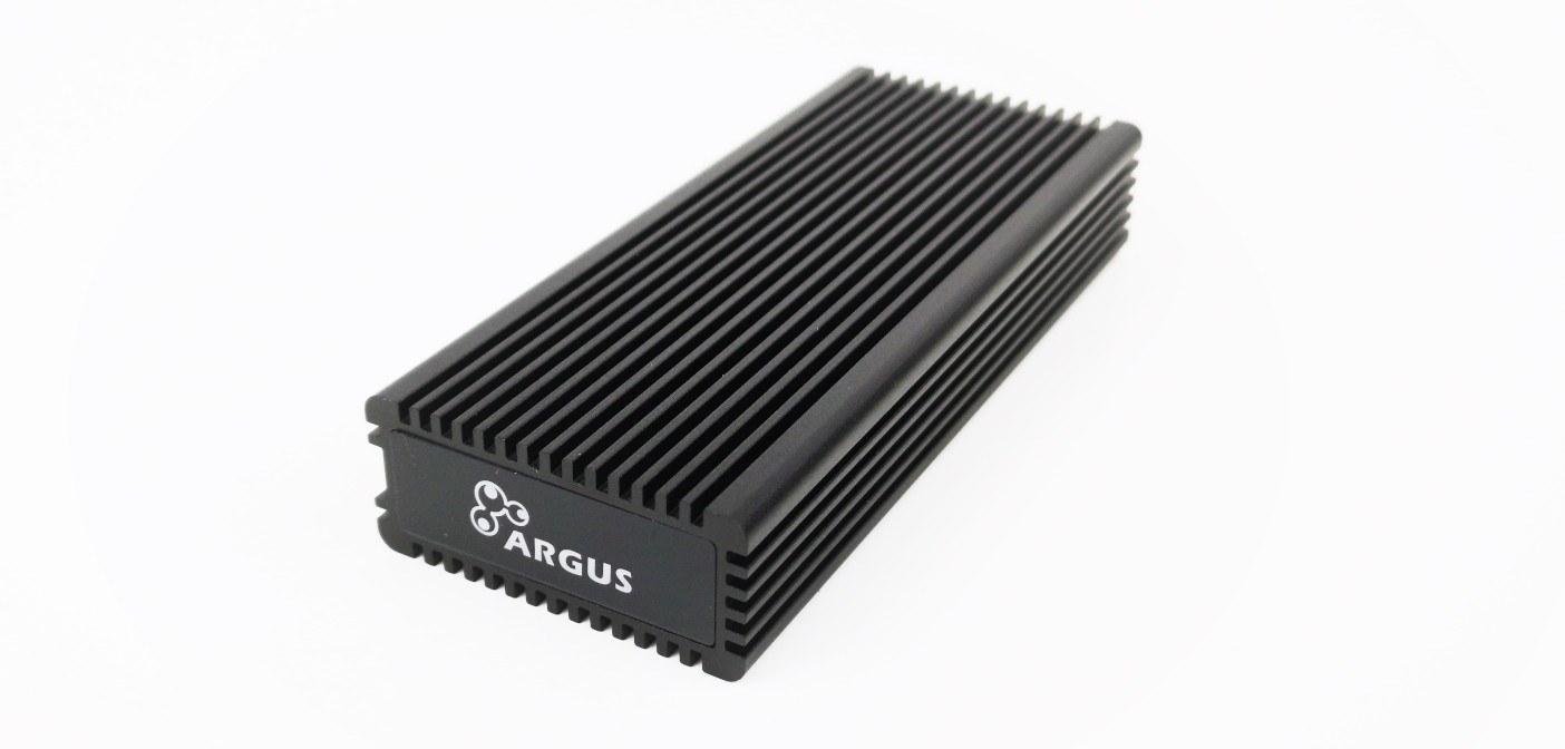 Wie schon erwähnt besteht das K-1685 Gehäuse aus Aluminium, welches schwarz eloxiert ist. Das dient nicht nur der Optik, denn über das Gehäuse wird auch die Wärme der NVMe abgeführt. An der Front ist das Argus-Logo zusehen und auf der Rückseite sitzt der USB 3.2 Gen2 Typ-C Anschluss, welcher mit 10 Gbit angebunden. Die innen liegende Platine kann einfach herausgeschoben werden. Diese bietet einen M.2 NVMe-Anschluss und ist nur für SSDs mit den Maßen 80 x 20 mm geeignet.