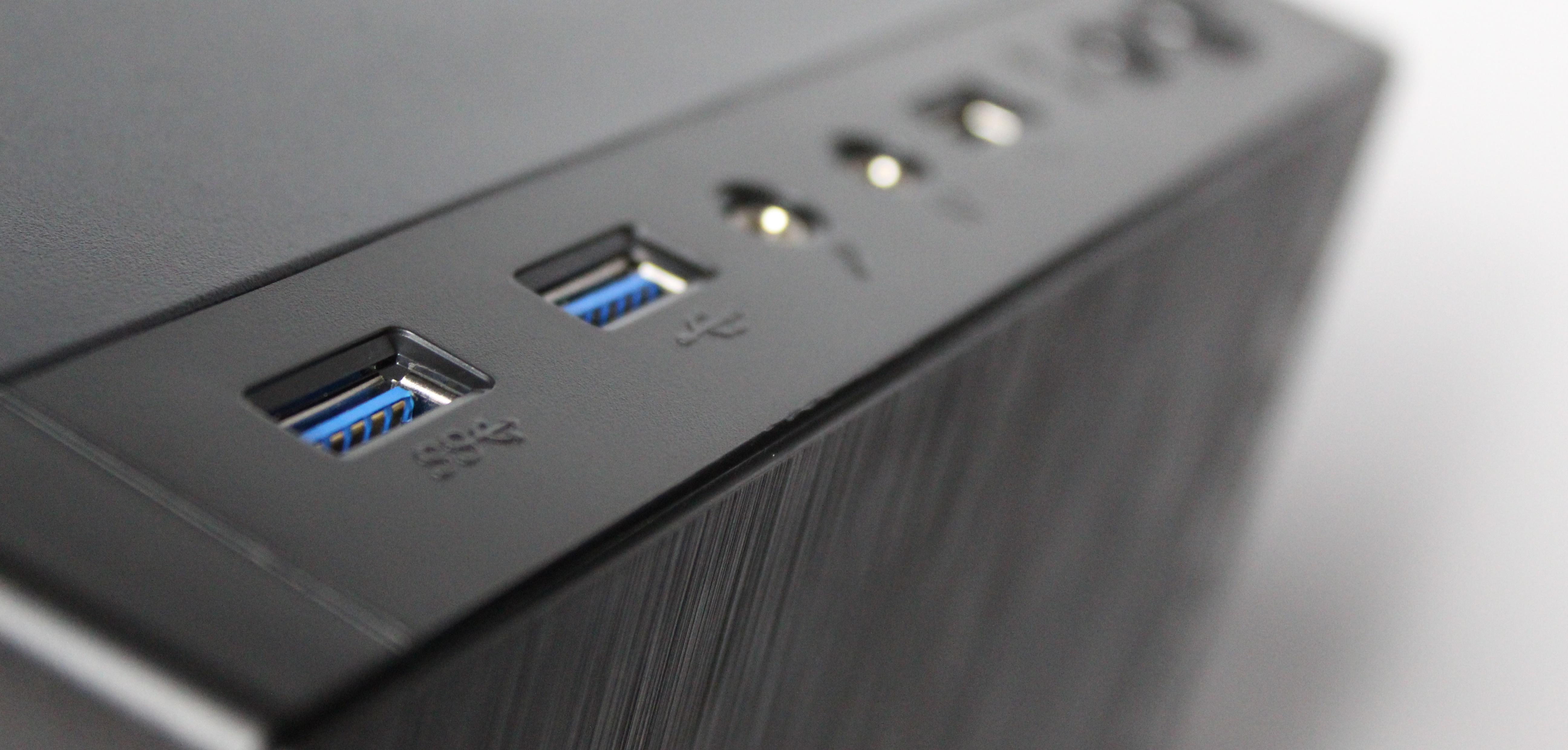 Auf der Oberseite wiederum befinden sich die tatsächlich nutzbaren Taster und Anschlüsse: 2x USB 3.0, 1x USB 2.0, HD Audio IN/OUT sowie der Ein/Ausschalter und der Resettaster runden das I/O Panel ab.