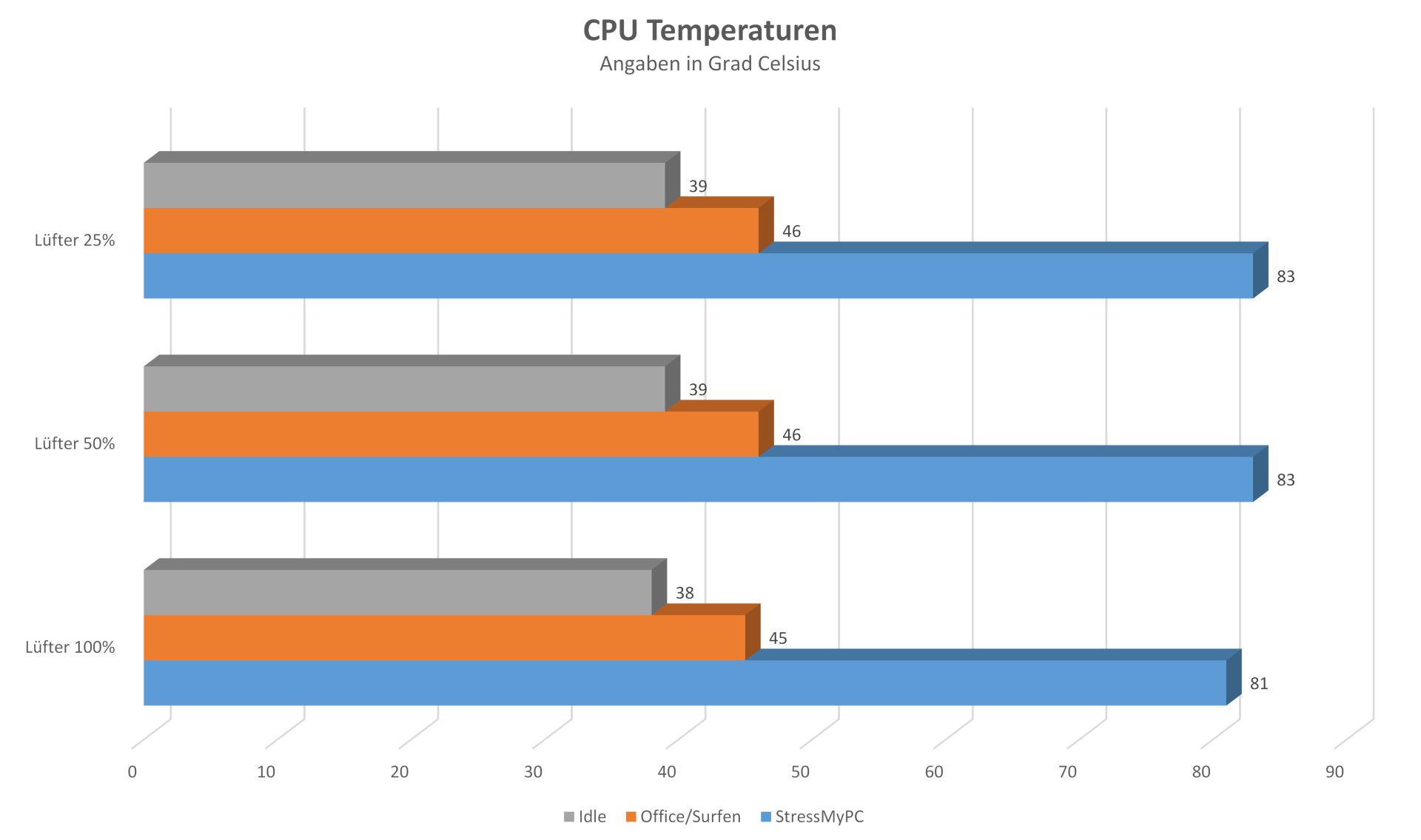 In unserem Test belassen wir es bei dem einen, bereits vormontierten Lüfter. Die Steuerungsmöglichkeiten bei dem eingesetzten Mainboard sind recht beschränkt, so betreiben wir den Lüfter mit jeweils 25, 50 und 100% der Drehzahl. Und alleine dieser Lüfter schafft es, dass der Prozessor bei Vollauslastung, bei maximal 83 Grad bleibt. In einem anderen Test erreichte der Prozessor ohne zusätzlichen Lüfter über 88 Grad. Die Dämpfung des Gehäuses arbeitet gut, denn obwohl das System nur in 30 cm Entfernung zu uns auf dem Schreibtisch steht hören das System kaum.