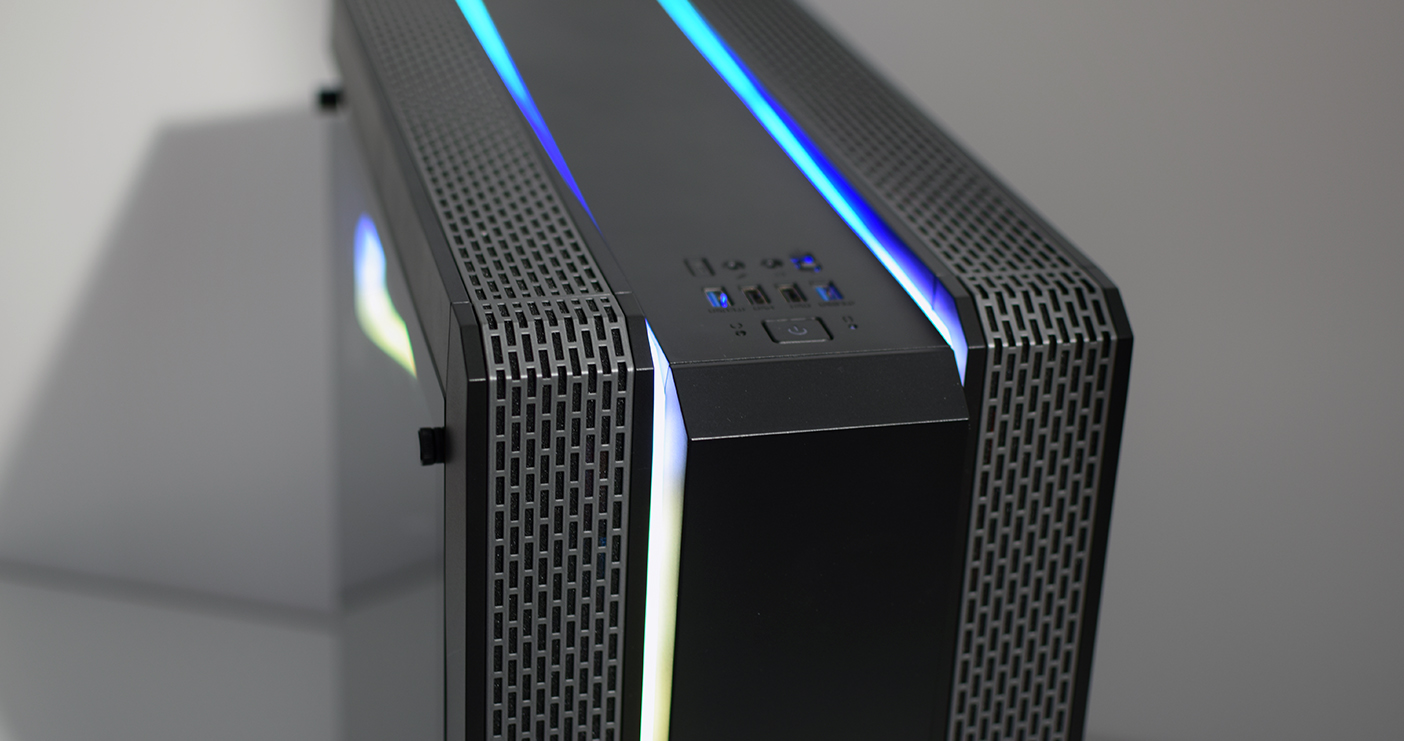 Schauen wir uns die Spaltmaße an, so fällt uns direkt ins Auge, dass alles ordentlich verarbeitet wurde. Die Einzelteile passen alle sehr gut zueinander. Die Scheibe wird in den Ecken von Gumminoppen auf den Muttern gehalten. Die grauen Zierstreifen sind Lüftungsgitter mit einem weichen dünnen Fließ darunter. Zwischen diesen sitzt das I/O-Frontpanel. Neben USB 3.0 und USB 2.0 werden uns der Fan-Controller und der RGB-Controller angeboten. Die Lüfter können in 3 Stufen angesteuert werden, die RGB-Streifen, bzw. alle RGBs am Hub werden in verschiedenen Modifikationen und verschiedenen Farben durchgeschaltet.
