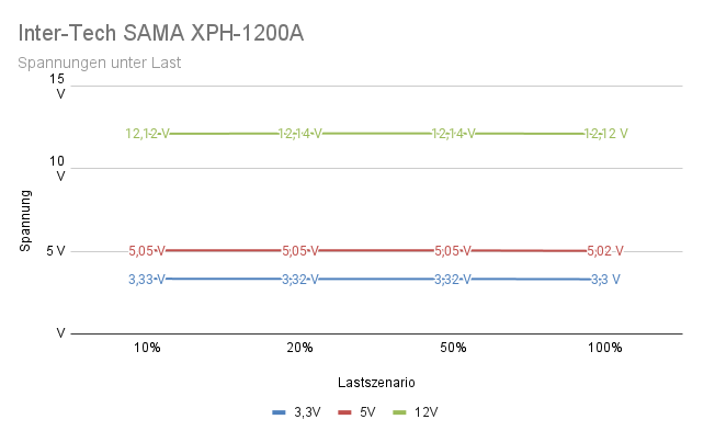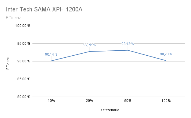 Das Inter-Tech SAMA XPH-1200A wurde aufgrund seiner Effizienz mit der 80Plus Platinum Zertifizierung ausgezeichnet. Der durchschnittliche Wirkungsgrad über alle Laststufen beträgt 91,55 %.