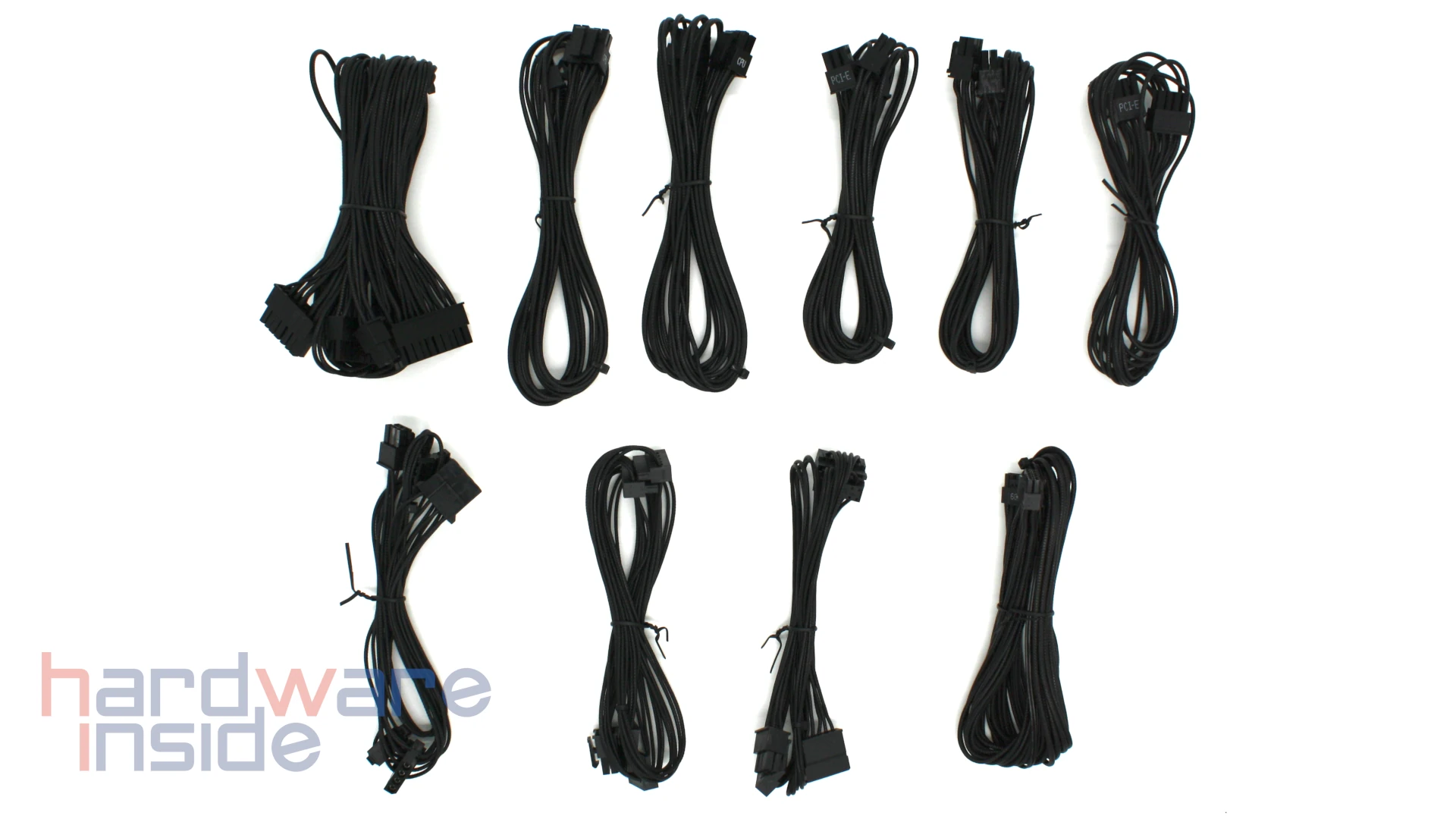 Da es sich beim Inter-Tech XPH-1200A um ein vollmodulares Netzteil handelt, stehen verschiedene Leitungen zur Verfügung, um die internen Komponenten des Systems mit Strom zu versorgen. Bei den Leitungen handelt es sich um einfache Leitungen, deren Oberfläche zwar strukturiert ist, die aber keine Ummantelung besitzen. Die einzelnen Adern der Leitungen sind nicht miteinander verbunden, was mehr Freiheit bei der Installation bietet, aber auch ein unordentlicheres Erscheinungsbild als Leitungen mit gebündelten Adern ergibt.